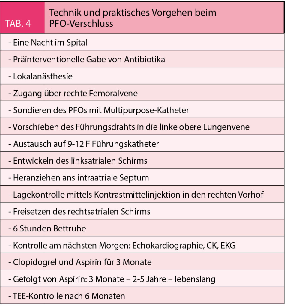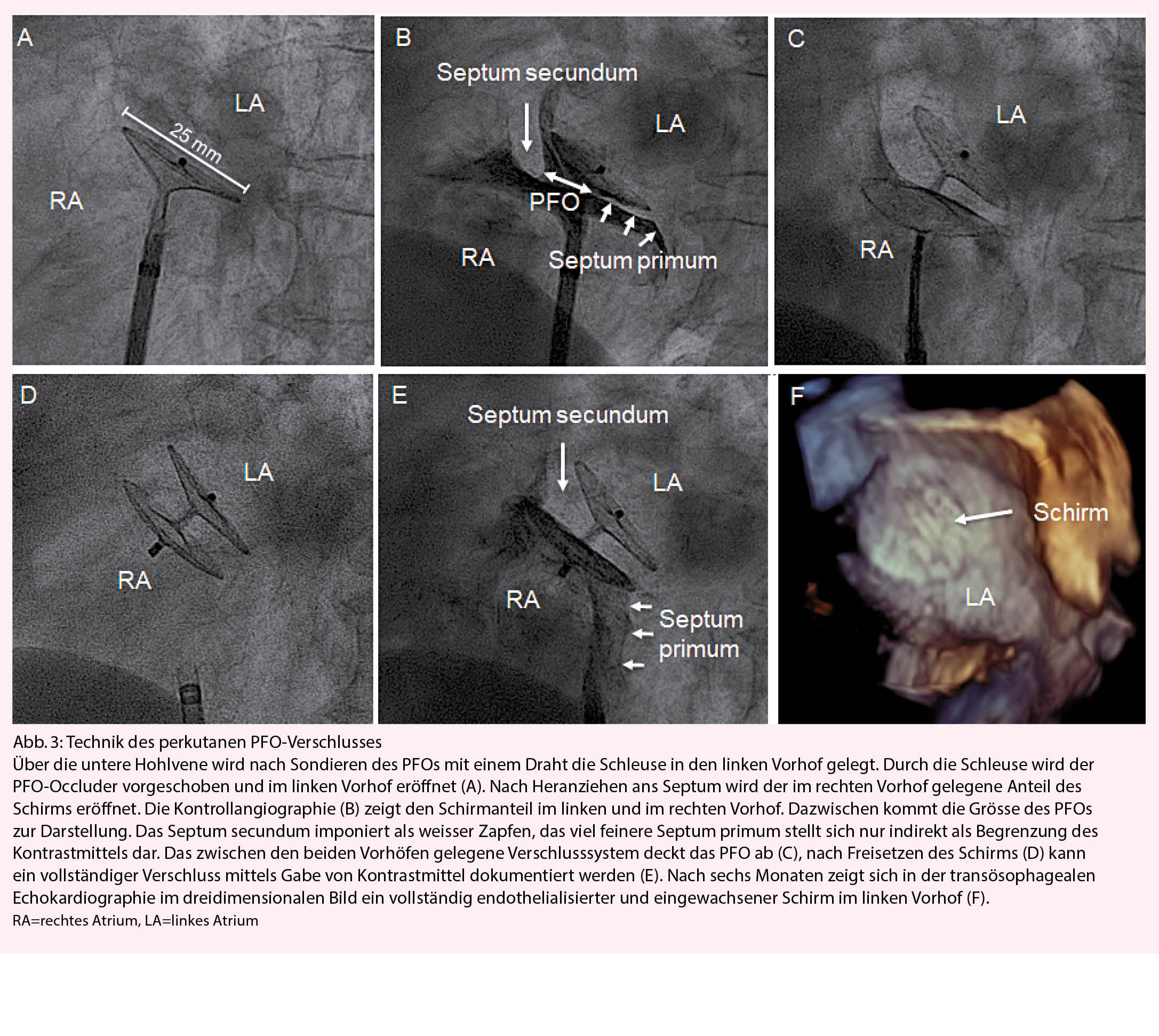 Der perkutane PFO-Verschluss wird in vielen Zentren unter Überwachung mittels Angiografie und TEE durchgeführt, was meist eine Vollnarkose nötig macht. Der PFO Verschluss ist auch mittels angiografischer Überwachung allein und bei Bedarf dem Einsatz einer intrakardialen Echokardiografiesonde, möglich. Allerdings ist eine vorgängige, qualitativ genügende TEE nötig, um den Eingriff zu planen. In der Tabelle 4 sind die Technik und das praktische Vorgehen wie es am Stadtspital Triemli praktiziert wird aufgeführt. Das Verschlusssystem wird über den Führungskatheter, welcher nach dem Sondieren des PFOs in der linken oberen Lungenvene oder im linken Vorhof liegt, eingeführt. Der linksatriale Anteil des Verschlusssystems wird im linken Vorhof eröffnet (Abb. 3A). Er entfaltet sich wie ein Schirm. Daher der Name Schirmverschluss. Der «Schirm» wird nun gegen das interatriale Septum gezogen und fasst das Septum primum und Septum secundum (Abb. 3B). Mittels Kontrastinjektion in den rechten Vorhof über den Führungskatheter wird die Position überprüft. Dann wird der rechtsatriale «Schirm» entfaltet und eine erneute Kontrolle der Position des PFO-Occluders durchgeführt (Abb. 3C). Bei guter Position wird der Occluder freigesetzt (Abb. 3D). Die Kontrolle am nächsten Tag umfasst eine transthorakale Echokardiographie zur Überprüfung der Lage des Occluders, eine Laborkontrolle zur Sicherstellung, dass keine kardiale Schädigung aufgetreten ist (CK, Troponin) und das Aufzeichnen eines EKGs zum Dokumentieren, dass der Patient nicht im Vorhofflimmern ist. Nach sechs Monaten wird eine Kontrollechokardiographie durchgeführt zur Überprüfung des vollständigen Einwachsens des Occluders (Abb. 3F). Die häufigste Komplikation bei der Implantation ist das Auftreten eines Hämatoms an der Einstichstelle. Selten kommt es zu anderen unerwünschten Komplikationen, wie z.B. eine Kontrastmittelallergie, vago-vasale Reaktion, oder kleinen Luftembolien. Noch seltener kommt es zu vaskulären Komplikationen an der Einstichstelle, einer Embolisation des Verschlusssystems oder einem Perikarderguss.
