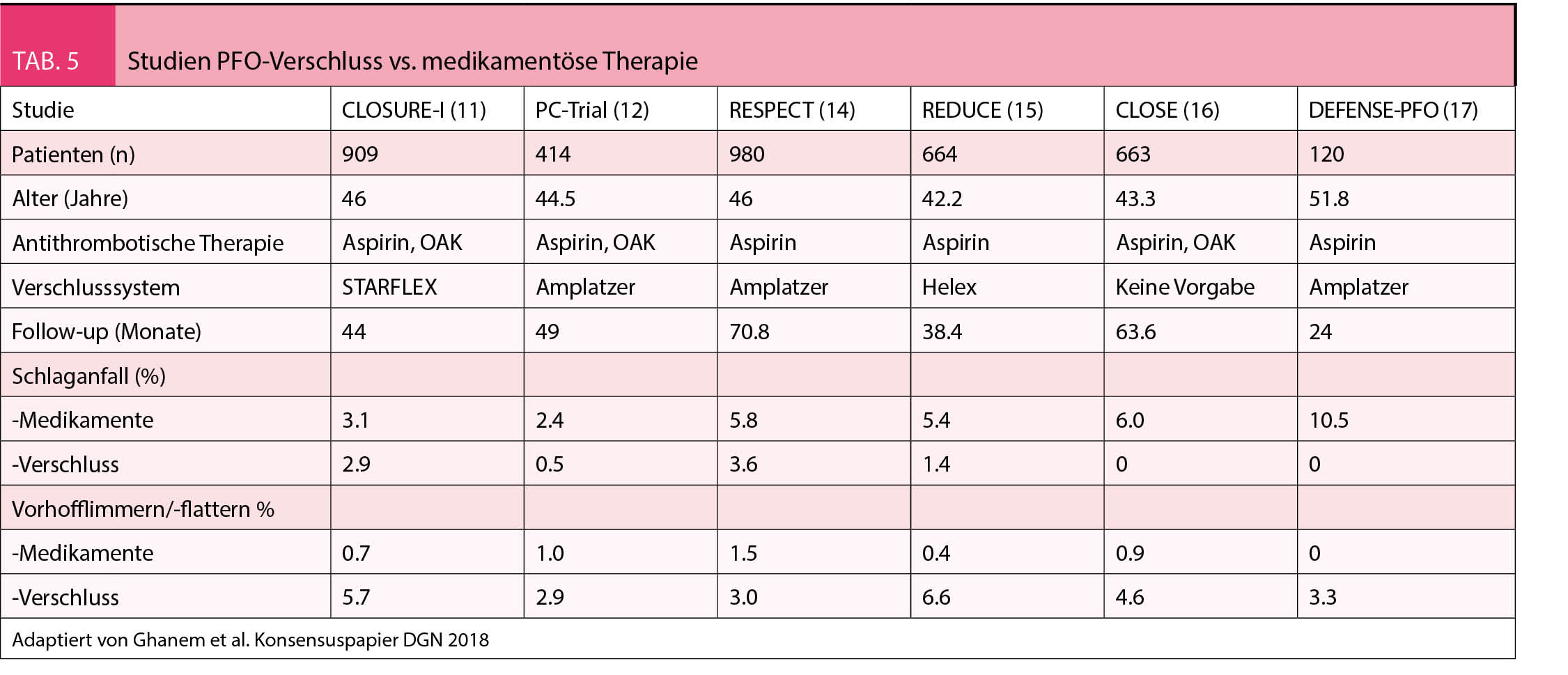 Aufgrund der Pathophysiologie der paradoxen Embolie bietet sich der Verschluss des PFOs für eine optimale Sekundärprävention an. Leider haben die ersten randomisierten Studien (CLOSURE I (11), PC-Trial (12), RESPECT (13), welche eine medikamentöse Therapie (Aspirin oder OAK) gegen den perkutanen PFO-Verschluss verglichen haben, keinen signifikanten Vorteil für den PFO-Verschluss gebracht. Die Ursachen für dieses neutrale Ergebnis waren neben einer suboptimalen Patientenselektion, eine niedrigere als erwartete Ereignisrate, eine zu kurze Nachbeobachtungszeit, viele «Crossovers» (12, 13) und Komplikationen durch ein schlechtes Verschlusssystem (11). Eine Verlängerung der Nachbeobachtungszeit hat denn auch im RESPECT-Trial den Vorteil des PFO-Verschlusses gegenüber der medikamentösen Therapie gezeigt (14). In der Folge wurden von Neurologen Studien durchgeführt, nämlich die REDUCE-Studien (15) und die CLOSE-Studie (16) und von Kardiologen die DEFENSE-PFO-Studie (17), welche den Vorteil des PFO-Verschlusses zur Verhinderung eines erneuten Schlaganfalls eindeutig belegten (Tab. 5).
