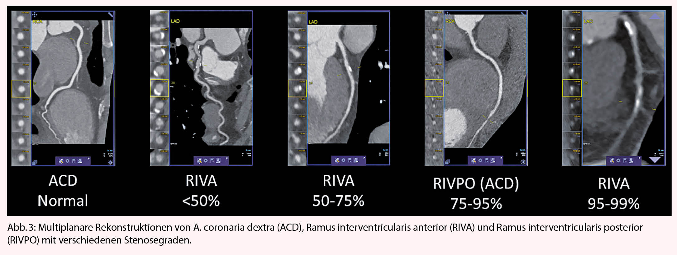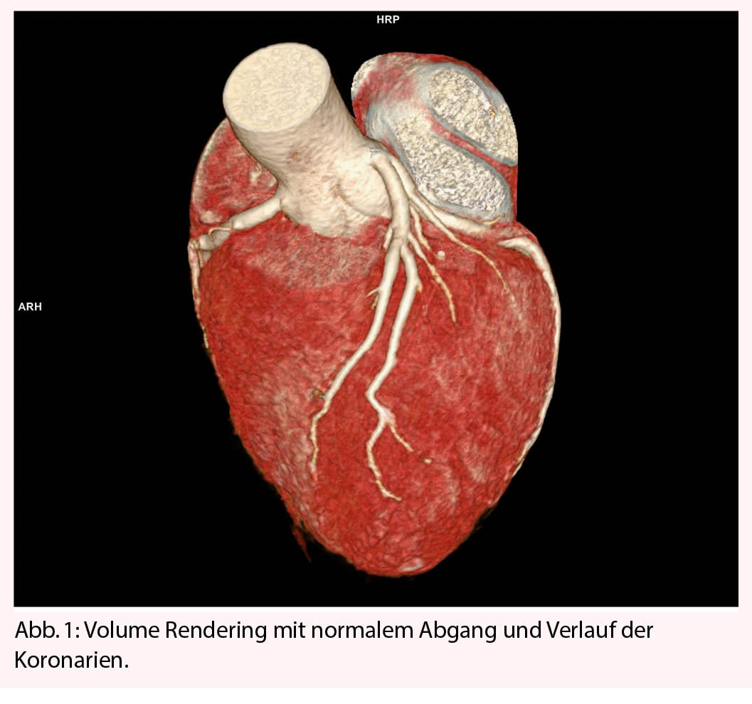 Das Herz–CT ist die einzige nicht-invasive Modalität, die eine komplette, routinemässige Darstellung der Koronararterien erlaubt. Zur Quantifizierung der koronaren Verkalkungen wird zunächst ein kontrastmittelfreier Scan des Herzens durchgeführt. Im Anschluss erfolgt meistens ein zweiter kontrastmittelunterstützter Scan zum Zeitpunkt der optimalen Kontrastierung der Koronarien. Hiermit können mögliche Stenosen durch verkalkte oder nicht-verkalkte (soft) Plaques evaluiert werden. Zudem lassen sich die Ostien und der Verlauf der Koronarien darstellen (Abb. 1), wodurch die Diagnostik von Koronaranomalien ermöglicht wird.