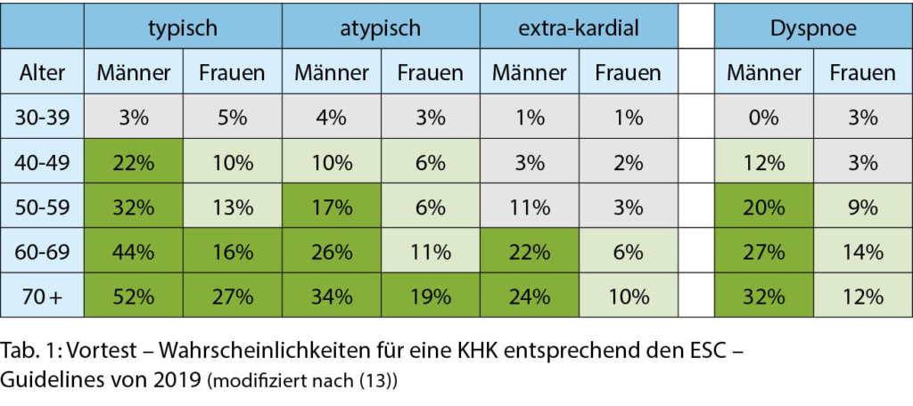 Die Anamnese und das Abschätzen der Vortest-Wahrscheinlichkeit stehen am Anfang jeder KHK – Abklärung und auch zur Wahl der zielführendsten bildgebenden Modalität für die Patienten. Die Abschätzung der Vortestwahrscheinlichkeit erfolgt z.B. mittels Tabellen, wie sie in den neuesten Guidelines des ESC publiziert ist (Tabelle 1; modifiziert nach (13)). Unter Hinzuziehen von kardiovaskulären Risikofaktoren, Ruhe- und Belastungs-EKG, linksventrikulärer Pumpfunktion oder aber auch der Höhe des Calciumscores kann die Bestimmung der klinischen Wahrscheinlichkeit für eine KHK weiter verbessert werden. Insgesamt sind die Vortestwahrscheinlichkeiten für eine KHK im Vergleich zu den vorherigen ESC Guidelines (2013 «Stable Coronary Artery disease») deutlich tiefer. Ansätze der «Artificial Intelligence» können helfen, die Vortestwahrscheinlichkeiten für eine KHK noch weiter zu verbessern (14).
