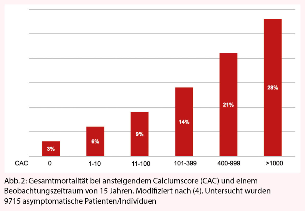 Der Calciumscore hat neben der diagnostischen eine wichtige prognostische Bedeutung: In einer grossen Studie mit 9715 Individuen zeigte sich, dass Individuen mit einem Calciumscore von 0 über einen Beobachtungszeitraum von 15 Jahren eine hervorragende Prognose mit tiefer Sterblichkeit von < 3% hatten; im Gegensatz dazu hatten Patienten mit einem Score > 1000 eine neun Mal höhere Mortalität (28%) (Abb. 2)(4).