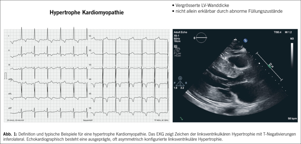 Die HCM ist definiert als das Vorliegen einer erhöhten linksventrikulären Wanddicke (mit oder ohne rechtsventrikulärer Hypertrophie) oder Masse, die nicht allein durch abnormale linksventrikuläre Füllungszustände erklärt werden kann (3). (Abb. 1)