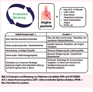 Die ISCHEMIA Studie (1, 2) hat Patienten mit stabiler KHK und mindestens moderater Ischämie gemäss einem nicht-invasiven Stresstest randomisiert zu initial Leitlinien-konformer medikamentöser Therapie (n=2591) oder einer Revaskulariation (n=2588) mit entweder perkutaner Koronarintervention (PCI) (74%) oder aortokoronarer Bypass (ACB) Operation (26%) zusätzlich zur medikamentösen Therapie. Während einer Beobachtungsdauer von im Median 3.2 Jahren, zeigte sich kein signifikanter Unterschied zwischen den Therapiestrategien in Bezug auf den primären Endpunkt kardiovaskuläre Mortalität, Myokardinfarkt, Hospitalisation für instabile Angina pectoris oder Herzinsuffizienz, überlebter plötzlicher Herztod (invasiv 16.4% versus konservativ 18.2%, HR=0.93, CI 0.80-1.08, p=0.34) oder den sekundären Endpunkt kardiale Mortalität oder Myokardinfarkt (invasiv 14.2% versus konservativ 16.5%, HR=0.90, CI 0.77-1.06, p=0.21). Die invasive Strategie zeigte jedoch eine deutliche Überlegenheit in Bezug auf die Lebensqualität, Häufigkeit von Angina pectoris und der körperlichen Belastbarkeit bei symptomatischen Patienten, welche unmittelbar nach dem Eingriff verzeichnet wurde und im Verlauf aufrechterhalten wurde.