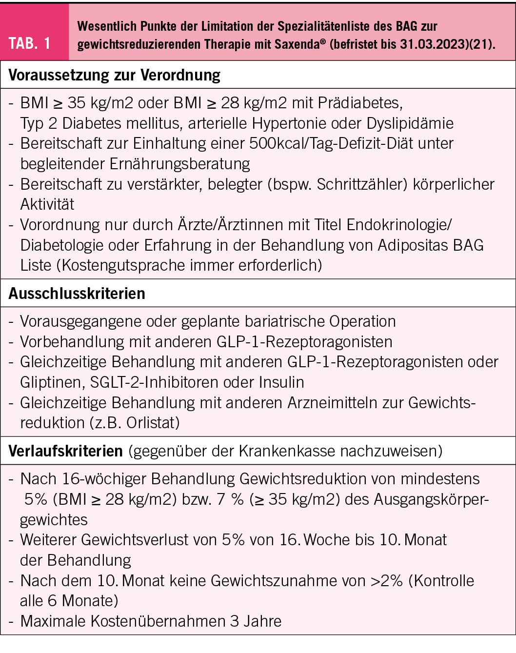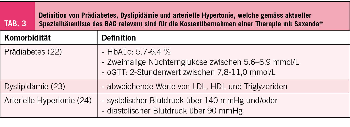 Die Limitatio der Spezialitätenliste definiert als Kriterium für eine Kostenübernahme einer Behandlung mit Saxenda® einen BMI von >28 (bis 35) kg/m2 verbunden mit dem Bestehen mindestens einer Übergewichts-assoziierten Komorbidität wie Prädiabetes, Dyslipidämie oder arterieller Hypertonie (Tab. 3). Einerseits macht die Konzentration der Finanzierung der Therapie auf Personen mit entsprechenden Komorbiditäten aus unserer Sicht Sinn, andererseits kann jedoch die explizite Einschränkung auf einzelne Komorbiditäten problematisch sein. Neben dieser BAG-seitig willkürlich definierten Komorbiditäten könnte man ebenso als finanzierungsbegründende Komorbiditäten das Schlafapnoesyndrom oder die Steatosis hepatis respektive Steatohepatitis aufführen. Ebenso sollten funktionelle Einschränkungen wie beispielsweise eine Gonarthrose sowie auch psychosoziale Beeinträchtigungen durch das Übergewicht Berücksichtigung finden. Letztlich ist es wie immer Aufgabe der ärztlichen Tätigkeit, eine differenzierte Abwägung hinsichtlich einer potenziellen Behandlungsindikation vorzunehmen.