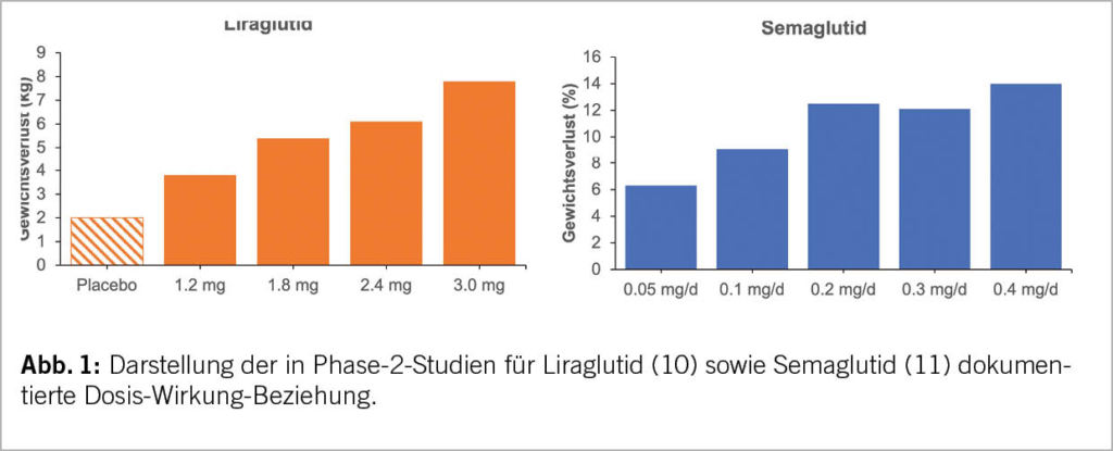 Weniger mit Adipositasmedizin vertraute Leserinnen und Leser wird es möglicherweise überraschen, dass bei Anti-Adipositas-Medikamenten ebenso wie in anderen pharmakologischen Bereichen der Medizin eine klare Dosis-Wirkung-Beziehung besteht. Abbildung 1 illustriert sowohl für Liraglutid als auch für Semaglutid diese Dosis-Wirkung-Beziehung aus Phase-2-Studien (10, 11). Für die klinische Praxis ist dies von grosser Bedeutung, da sich durch eine Dosisanpassung des verabreichten GLP-1-RA die Entwicklung des Körpergewichtes bei den meisten Patienten recht gut voraussehen und ggf. auch steuern lässt.