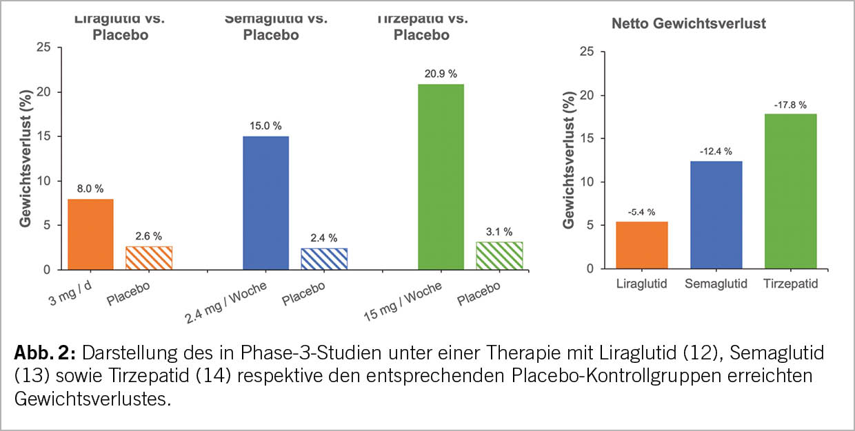 Wie in Abbildung 2 gut erkennbar, ist 2.4 mg Semaglutid einmal pro Woche s.c. deutlich wirksamer bzgl. Gewichtsreduktion als die tägliche Applikation von 1 mg Liraglutid. Noch effektiver scheint jedoch die wöchentliche Gabe von 15 mg Tirzepatid zu sein. Da auch in den Placebogruppen, wohl aufgrund der gleichzeitigen Lebensstilintervention, das Gewicht etwas abnahm, ist immer der medikamentöse Nettoeffekt jeweils durch Subtraktion des in der Placebogruppe erzielten Gewichtsverlusts von dem der medikamentösen Behandlungsgruppe zu errechnen (Abb. 2).