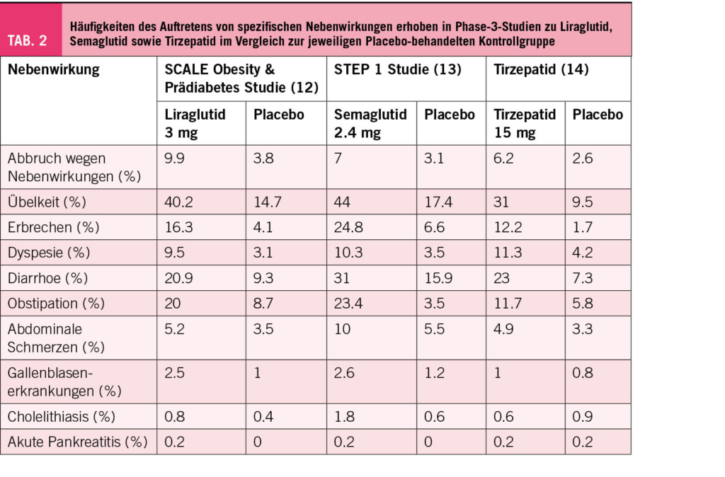 Wie die meisten medikamentösen Therapien haben auch die beschriebenen Medikamente der Adipositastherapie Nebenwirkungen. Eine Übersicht der in den drei analysierten Studien vermehrt beobachteten Nebenwirkungen haben wir in Tabelle 2 zusammengefasst. Dabei stehen gastrointestinale Beschwerden klar im Vordergrund. Diese treten meist zu Beginn der Behandlung auf und lassen sich durch eine langsame Dosissteigerung oft limitieren. Im weiteren Verlauf verschwinden sie dann häufig oder reduzieren sich zumindest auf ein akzeptables Ausprägungsniveau. Es gibt jedoch auch Personen, welche die Medikamente schlichtweg nicht vertragen oder ein unzureichendes Ansprechen auf die Therapie zeigen. In dieser Situation sollte die Therapie frühzeitig beendet werden.