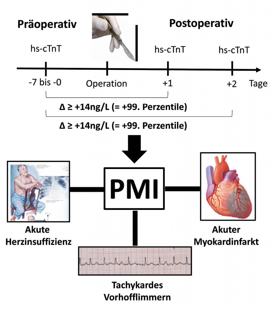 Oberer Abschnitt: Schematische Darstellung des Ablaufs des Routinescreenings für perioperative Myokardischämien (PMI) nach nichtkardialen Operationen in Risikopatienten inkl. Diagnosekriterium für PMI auf Basis von hochsensitivem kardialen Troponin T (hs-cTnT). Unterer Abschnitt: wichtige kardiale Ursachen für PMI