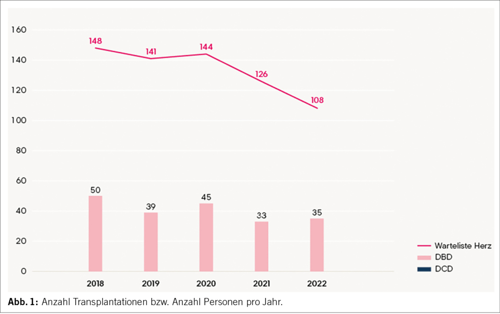 Die Herztransplantation ist der Goldstandard für die Behandlung der terminalen, therapierefraktären Herzinsuffizienz mit über 100’000 Transplantationen seit der Erstimplantation 1967 (2). Aufgrund deutlicher Fortschritte im Bereich der Immunsuppression, Organpräservation, Erkenntnissen der Histokompabilität und Operationstechniken, stellt die Herztransplantation eine effektive Behandlung der terminalen Herzinsuffizienz dar. Das mittlere Überleben nach Herztransplantation beträgt 10-15 Jahre. In der Schweiz wurden jährlich zuletzt 40 Herzen transplantiert. Eine Diskrepanz besteht zwischen Angebot und Nachfrage und viele Patienten versterben auf der Warteliste (Abb. 1). Zudem wird letztendlich nur ein Drittel aller potentiellen Spenderorgane vergeben (3).