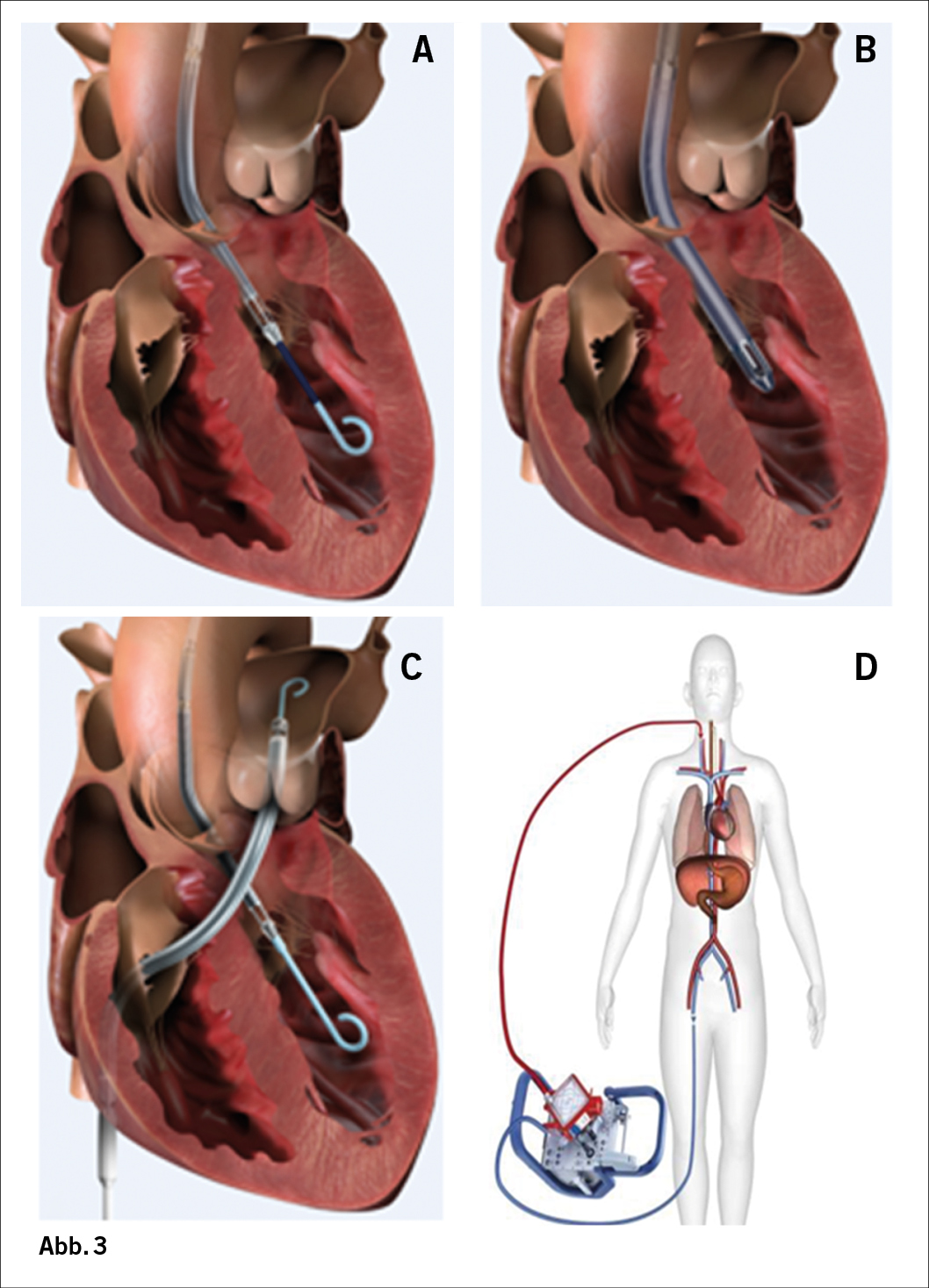Sollte ein zusätzliches Rechtsherzversagen oder Oxygenationsproblem vorliegen, kann die Impella mit einer ECMO (Abb. 3D) oder einem perkutanem Rechtherzunterstützungssystem (Impella RP® oder PROTEK DUO® Kanüle) (Abb. 3C) kombiniert werden.