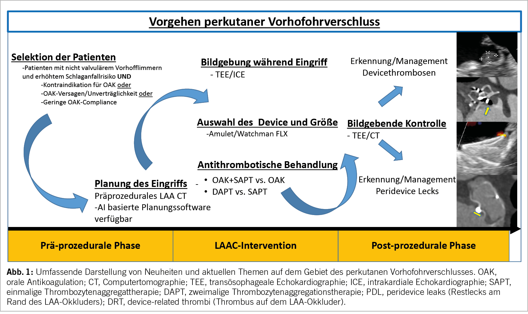 Der perkutane Vorhofohrverschluss (LAAC) hat sich in der klinischen Praxis als mögliche Alternative zur oralen Antikoagulation (OAK) zur Schlaganfallprävention bei Patienten mit nicht valvulärem Vorhofflimmern (AF) etabliert. In den letzten 2 Jahrzehnten hat sich viel bewegt: Die Zahl der LAAC-Eingriffe ist exponentiell gestiegen (1), neue Devices wurden zugelassen oder befinden sich in der klinischen Entwicklung (2), Bildgebungstechnologien haben sich weiterentwickelt (3-5), das technische Fachwissen und der Implantationsprozess haben sich gefestigt (1) und es wurden Resultate von mehreren wichtigen Studien publiziert (2, 6-9). Das Konzept einer verbesserten Thromboembolieprophylaxe durch einen vollständigen Verschluss des linken Vorhofs wurde in der multizentrischen, randomisierten LAAOS III Studie eindrücklich demonstriert. Bei fast 5’000 Patienten mit Vorhofflimmern, die sich aufgrund einer anderen Indikation einer Herzoperation unterzogen, hat sich gezeigt, dass die chirurgische Ligatur des linken Vorhofsohrs das Risiko eines Schlaganfalls oder einer systemischen Embolie wesentlich reduziert (Hazard Ration [HR]: 0.67; 95% Confidence Interval [CI]: 0.53-0.85; p=0.001) während einem durchschnittlichen Follow-up von 3,8 Jahren (9). Interessanterweise wurde in beiden Studiengruppen die OAK fortgesetzt, was auf eine synergistische Wirkung von OAK und LAAC hindeutet.