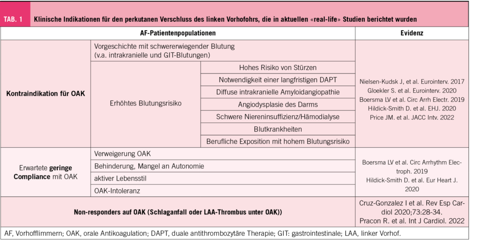 Die aktuellen Leitlinien der Europäischen (10) und der Amerikanischen (11) Gesellschaft für Kardiologie ziehen den LAAC in Betracht, falls eine langfristige OAK nicht in Frage kommt (Indikationslevel IIb, Evidenzgrad: B). Patienten mit schweren Blutungen in der Vorgeschichte oder hohem Blutungsrisiko gehören zu dieser Gruppe (Tab. 1) (12). Darüber hinaus kann ein LAAC auch in anderen klinischen Szenarien in Betracht gezogen werden, die mit einem «Versagen» der OAK-Strategie einhergehen, wie z. B. einer OAK-Unverträglichkeit/Allergie, einer fehlenden Compliance, einem embolischen Schlaganfall trotz OAK («breakthrough stroke») oder einem Thrombus im linken Vorhofohr trotz OAK. Eine Substudie des Amplatzer Cardiac Plug Registry mit 115 Patienten, die aufgrund eines Schlaganfalls unter OAK mit LAAC behandelt wurden, ergab nach einer mittleren klinischen Nachbeobachtungszeit von 16,2 Monaten eine jährliche Schlaganfall-/Transitorische Ischämische Attacke Inzidenz von 2,6 %, was einer 65 % Risikoreduktion im Vergleich zu dem durch den CHA2DS2VASC-Score vorhergesagten Risiko entspricht (13).