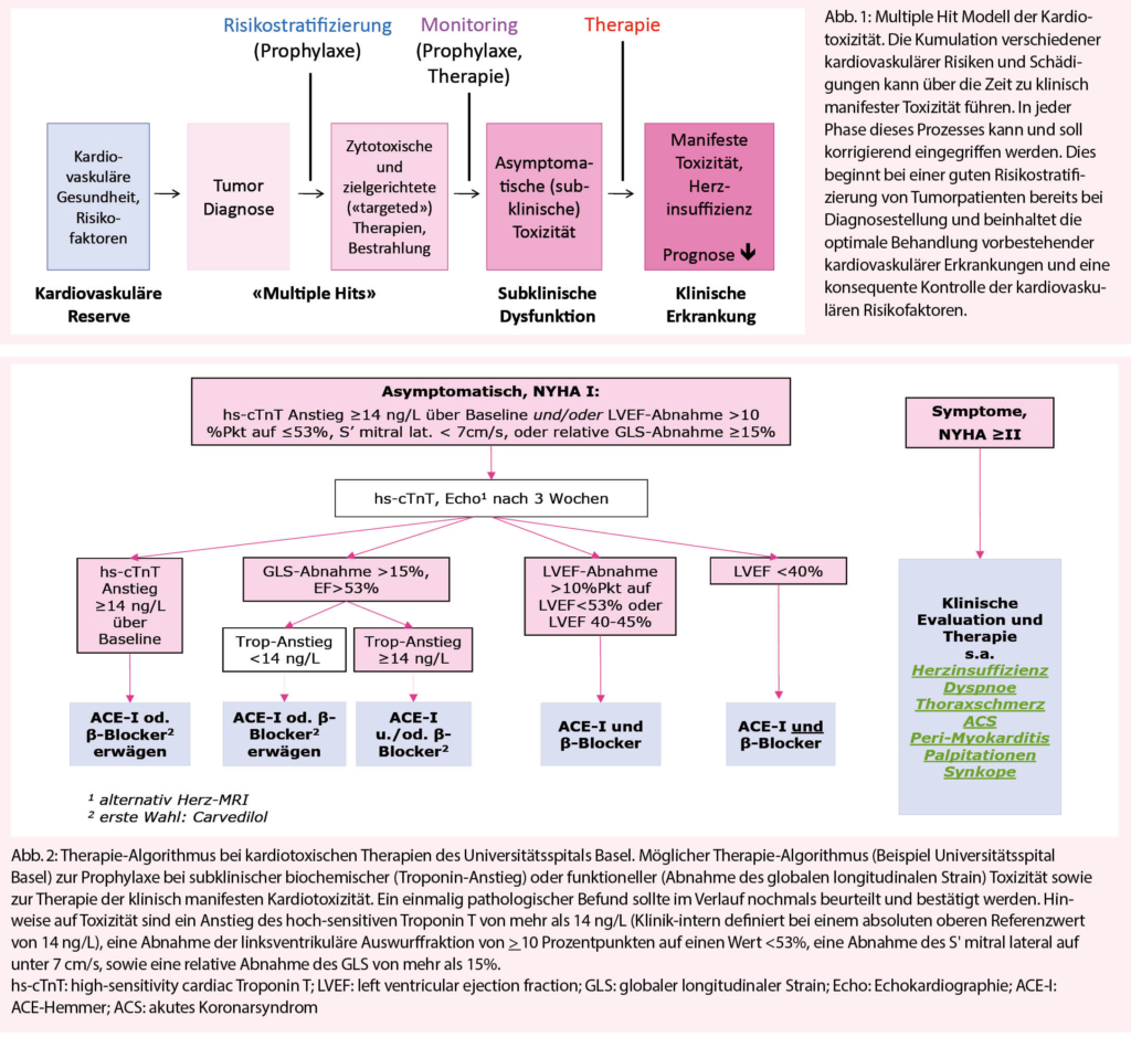 Von den klassischen, kardiotoxischen Chemotherapien nach wie vor regelmässig eingesetzt werden Anthrazykline (Doxorubicin, Daunorubicin, Epirubicin, Idarubicin und Mitoxantron) sowie alkylierende Substanzen (Cyclophosphamid und Ifosfamid). Anthrazykline kommen vorwiegend in der Behandlung von Lymphomen, akuten Leukämien, Sarkomen und dem Mammakarzinom zur Anwendung. Die Anthrazyklin-assoziierte kardiale Dysfunktion zeigt eine Abhängigkeit von der kumulativen Dosis und steigt bei > 400 mg/m2 Doxorubicin exponentiell von ca. 5% auf > 26% an (3). Allerdings können bereits niedrigere Dosen kardiotoxisch sein, insbesondere wenn im juvenilen oder jungen Adoleszenzalter verabreicht (> 250 mg / m2). Als diagnostisch für eine Kardiotoxizität gilt eine Abnahme der linksventrikulären Auswurffraktion (LVEF) um mehr als 10 Prozentpunkte unter den Normwert (53% gemäss Definition der Echokardiographie-Gesellschaften) (4). Heutzutage können mit Hilfe eines engmaschigen Monitorings mittels hoch-sensitiver Troponine sowie Speckle-Tracking Echokardiographie mit Strain-Messung (globaler longitudinaler Strain, GLS) bereits subklinische Formen der Toxizität erkannt werden, die eine frühzeitige Prophylaxe bzw. Behandlung ermöglichen. Dabei werden ACE-Hemmer (oder Angiotensin Rezeptor Blocker (ARB)) und Beta-Blocker eingesetzt (5). Ein möglicher Therapiealgorithmus ist in Abbildung 2 wiedergegeben (aktueller Algorithmus des Universitätsspitals Basel). Nach Anthrazyklin-haltiger Chemotherapie sollten die Patienten lebenslang, bei normalen Befunden und wenn asymptomatisch z.B. alle 5 Jahre, nachkontrolliert werden, um auch die spät auftretenden Kardiomyopathien nicht zu verpassen. Kardiale Dysfunktion und Kardiomyopathien werden auch in Zusammenhang mit Cyclophosphamid und Ifosfamid beobachtet, welche oft in Kombination mit Anthrazyklinen und in hohen Dosen (z.B. vor Stammzell-Transplantation) verabreicht werden (6). Im Gegensatz zu den Anthrazyklinen tritt diese Toxizität in aller Regel jedoch zeitnah zur Verabreichung auf. Auch diese Patienten bedürfen einem entsprechenden kardialen Monitoring.