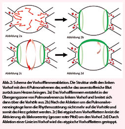 Für die Katheterablation wird ein Zugang über die Leiste gewählt. Via Vena cava inferior gelangt man in den rechten Vorhof. Es erfolgt eine transseptale Punktion, das heisst eine Punktion des Vorhofseptums, um in den linken Vorhof zu gelangen. Der linke Vorhof und der Eingang zu den Pulmonalvenen wird mit Hilfe eines technischen Systems dreidimensional abgebildet. Bei der Radiofrequenzablation wird im Bereich der Ostien der Pulmonalvenen Wärme abgegeben um Linien zur elektrischen Isolation zu ziehen. Bei Cryo-Ablationen wird mittels eines Ballons, welcher in die Ostien der Pulmonalvenen gelegt wird, Kälte abgegeben, um eine elektrische Isolation der Pulmonalvenen zu erzeugen. Die vollständige elektrische Isolation ist bei beiden Methoden erreicht, wenn keine elektrischen Signale mehr vom Vorhof in die Pulmonalvenen gelangen. (Abb. 2). Im Falle eines Rezidivs werden bei der Reintervention die wieder leitenden Gaps in den Isolationslinien gesucht und erneut verschlossen. Die Hospitalisation dauert 2-3 Tage. Die Untersuchung kann, je nach Wunsch und Komorbiditäten des Patienten, in Analgosedation oder in Intubationsnarkose durchgeführt werden. Die periinterventionellen Komplikationen sind selten. Am wichtigsten sind der Hirnschlag 0.5%, vaskuläre Probleme (Zugang), wobei nur 0.5% der Patienten eine Intervention oder Operation brauchen, sowie die Perikardtamponade 0.8% (1, 18). Extrem selten sind atrio-oesophageale Fisteln.