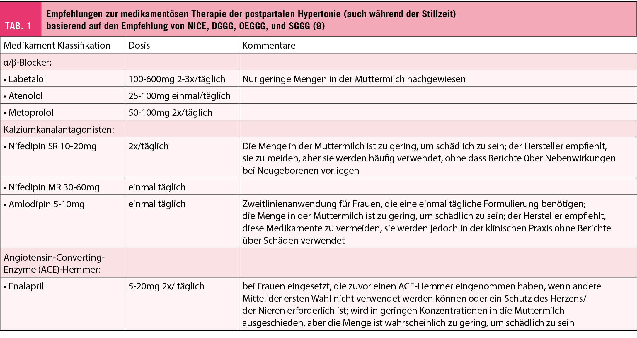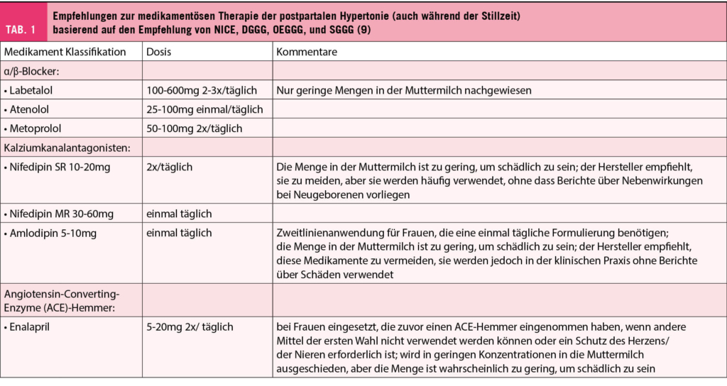 Sobald eine postpartale Hypertonie diagnostiziert wurde, ist eine medizinische Behandlung angezeigt und sollte nicht aufgeschoben werden (6). Dazu gehören das Absetzen von NSAR, die Beurteilung und konsequente Behandlung von Schmerzen und das Absetzen unnötiger intravenöser Flüssigkeiten (6). Die Patientinnen sollten beruhigt und darüber aufgeklärt werden, dass die eingesetzten Medi­kamente für Mutter und Kind sicher sind.