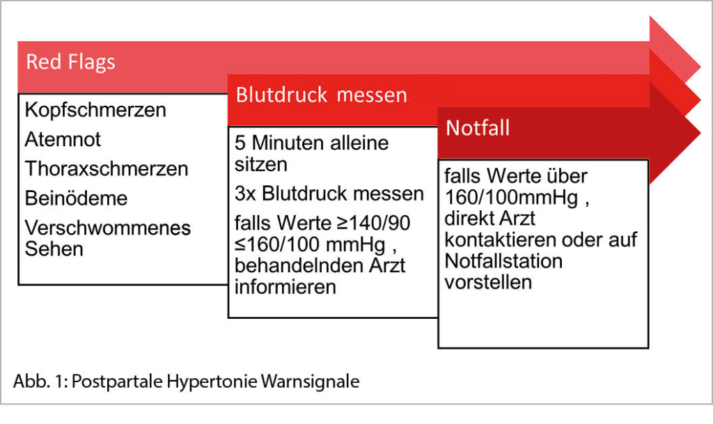 Die medizinischen Kontakte, die eine Woche nach der Entlassung stattfinden sollten, können persönlich wahrgenommen werden. Alternativ können telemedizinische Methoden und Telemonitoring für das poststationäre Management verwendet werden. Dies gilt vor allem dann, wenn vor der Entlassung eine gute Kommunikation mit der Patientin und ein Verständnis für Warnzeichen des Bluthochdrucks erreicht werden kann (Abb. 1). Essentiell in diesem Fall sind technisch korrekte Heimblutdruckmessungen, um eine optimale Datengrundlage für Behandlungsentscheide zu haben. Hier empfehlen wir die Patientin entsprechend zu instruieren. Je nach Institution stehen auch Gesundheits-Applikationen zur Verfügung, die die Patientin anleiten, standardisierte Messungen durchzuführen. Aus unserer Erfahrung heraus kann durch den Einsatz von telemedizinischen Methoden die Anzahl von physischen Konsultationen im Spital minimiert werden.