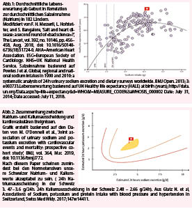 Eine ausgesprochen gesundheitsschädigende Wirkung des Salzkonsums wurde früh vermutet: Bereits 1949 bezeichnete der amerikanische Arzt Dennison AD Jr. das Salz als «cardiac nemesis» (1); Derzeit empfiehlt die European Society of Cardiology ESC nicht nur die Reduktion des Salzkonsums, sondern dessen Restriktion auf eine tägliche Einnahme < 5,0 g pro Person bei Hypertonikern (IA) (2); die American Heart Association AHA empfiehlt eine Restriktion auf maximal 3,5 g nicht nur bei Hypertonikern, sondern auch bei Normotensiven (IA) (3), entsprechend hat sich die World Health Organization WHO eine Salzrestriktion <5,0 g pro Tag in der Gesamtbevölkerung zum Ziel gemacht (4). Dieser Grenzwert basiert auf der in mehreren Studien erreichten Reduktion des Blutdruckes durch eine Salzrestriktion (5, 6). Von dieser Salzrestriktion verspricht sich die WHO eine weltweite Reduktion der jährlichen kardiovaskulären Todesfälle um bis zu 2,5 Millionen (!) (4). Basierend auf einer Hochrechnung geht man davon aus, dass ein nationales Programm zur Reduzierung der täglichen Salzzufuhr um 3 g (1200 mg Natrium) in den USA die jährliche Zahl der neuaufgetretenen Schlaganfälle um 32.000 bis 66.000, die Zahl der Herzinfarkte um 54.000 bis 99.000 und die Zahl der Todesfälle jeglicher Ursache um 44.000 bis 92.000 reduzieren könnte (7).