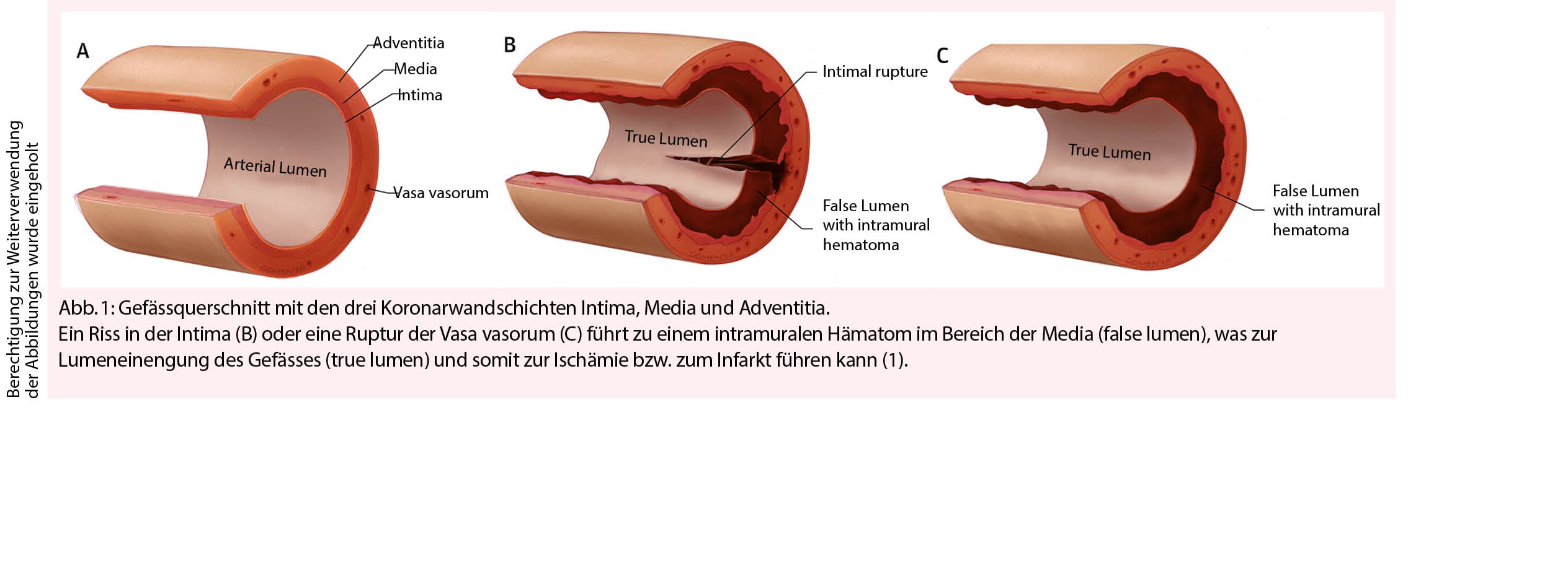 Durch einen Riss in der Intima oder eine spontane Ruptur der Vasa vasorum bildet sich ein intramurales Hämatom innerhalb oder zwischen einer dieser drei Schichten (2). Das wahre Gefässlumen wird komprimiert, was den koronaren Blutfluss behindern und so zum Infarkt führen kann (Abbildung 1) (3).