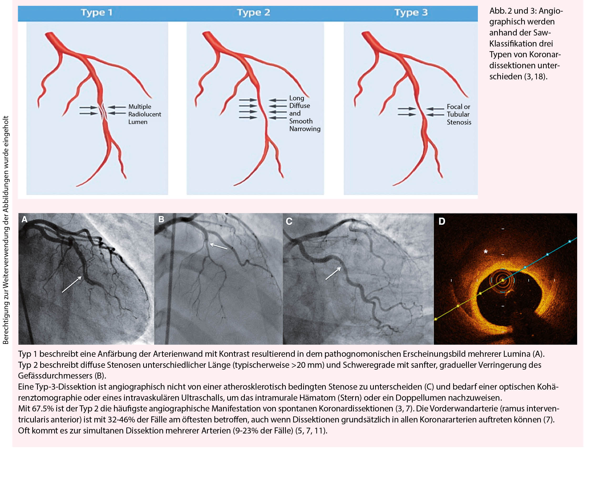 Bei der Interpretation der Koronarangiographie sollten vor allem junges Alter, weibliches Geschlecht und das Fehlen herkömmlicher kardiovaskulärer Risikofaktoren den Verdacht auf eine spontane Koronardissektion aufkommen lassen (10). Obwohl diese meist multifaktoriell bedingt ist, können das Vorhandensein prädisponierender Faktoren wie einer fibromuskulären Dysplasie (72-86% Prävalenz bei Patienten mit spontaner Koronardissektion (1, 7, 12)) oder anderen Vaskulopathien (Ehlers-Danlos, Marfan, o.ä.) oder dem akuten Schmerzereignis vorgängiger physischer oder psychischer Stress Hinweise für die Ätiologie des Herzinfarktes liefern (7, 13, 14).