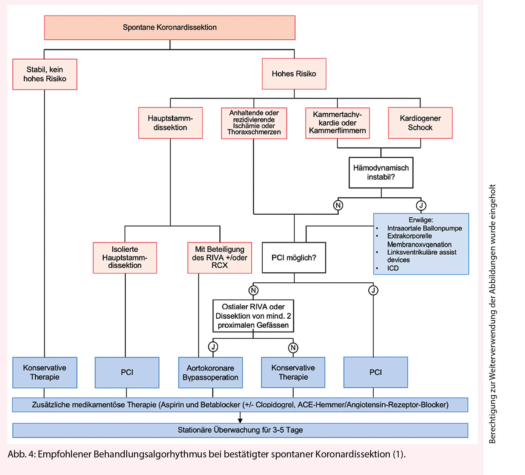 Die perkutane Koronarintervention zur Behandlung spontaner Koronardissektionen geht im Vergleich zur Revaskularisation atherosklerotisch bedingter Ursachen mit relativ niedrigen Erfolgsraten (~50-70%; ~10% Bedarf einer notfallmässigen aortokoronaren Bypass-Operation) sowie einem erhöhten Risiko von In-Stent-Restenosen und Stentthrombosen nach Resorption des intramuralen Hämatoms sekundär malapponierter Stents einher (10). Aus diesem Grund sollte die interventionelle oder chirurgische Revaskularisation abhängig von der Koronaranatomie lediglich Hochrisiko-Patienten mit entweder Hauptstamm-Dissektion, anhaltender Ischämie, wiederkehrenden Thoraxschmerzen, ventrikulären Arrhythmien oder hämodynamischer Instabilität vorbehalten bleiben (Abb. 4) (1).