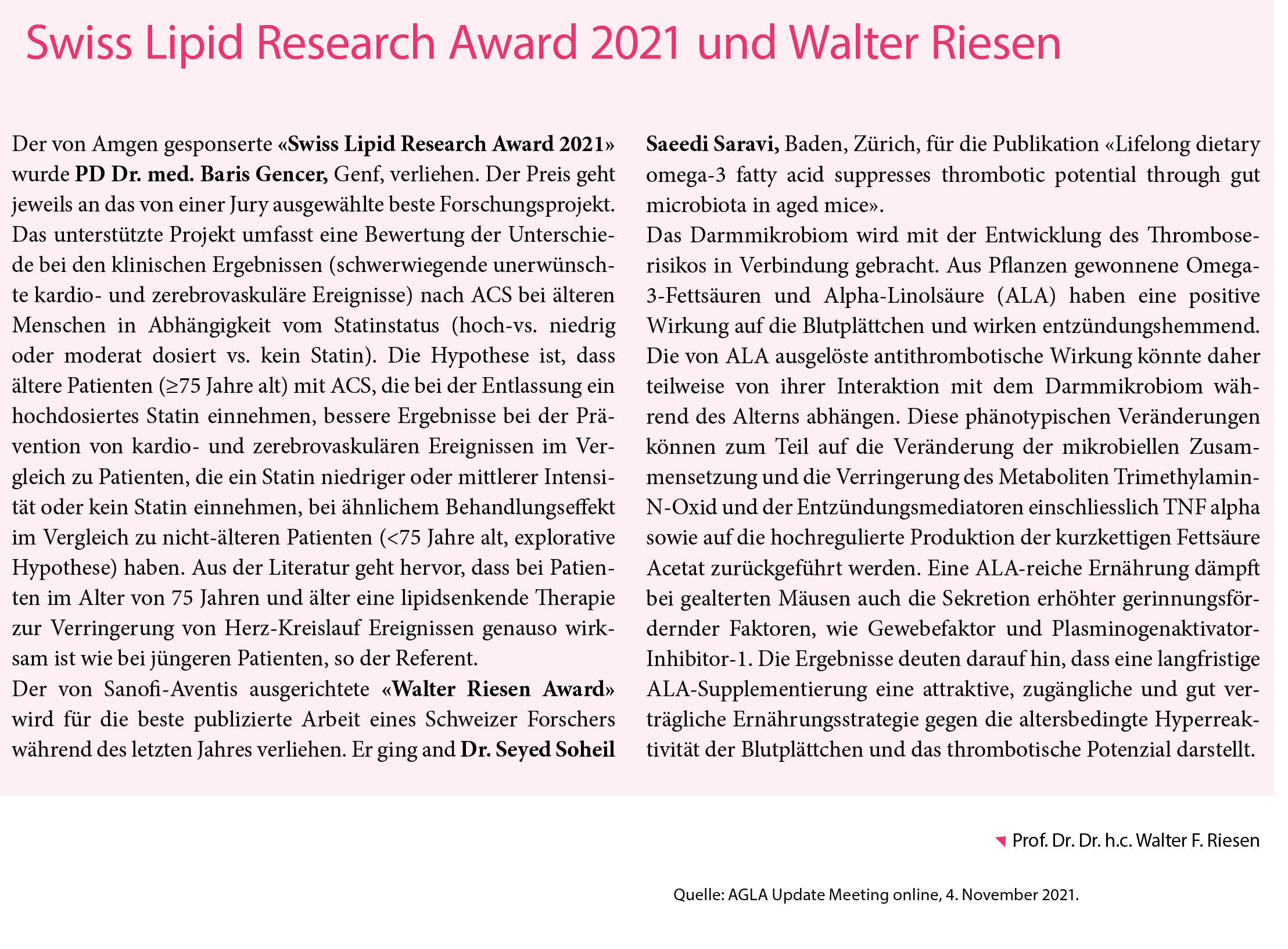Das traditionelle AGLA Update Meeting fand dieses Jahr wiederum online unter der perfekten Organisation von Medworld AG, Steinhausen, statt. Namhafte Schweizer Experten berichteten in hervorragenden Vorträgen über neue für die Praxis relevante Erkenntnisse, auf den Gebieten der Antithrombotika, der familiären Hypercholesterinämie und der lipidsenkenden Therapie. Die Keynote Lecture handelte von einem neuen Therapiekonzept bei schweren Hyperlipidämien, der Inhibition der Angiopoietin-ähnlichen Proteine. Zudem berichteten die beiden Träger des Swiss Lipid Awards (Amgen) und des Walter Riesen Awards (Sanofi-Aventis) über ihre Forschungsergebnisse.