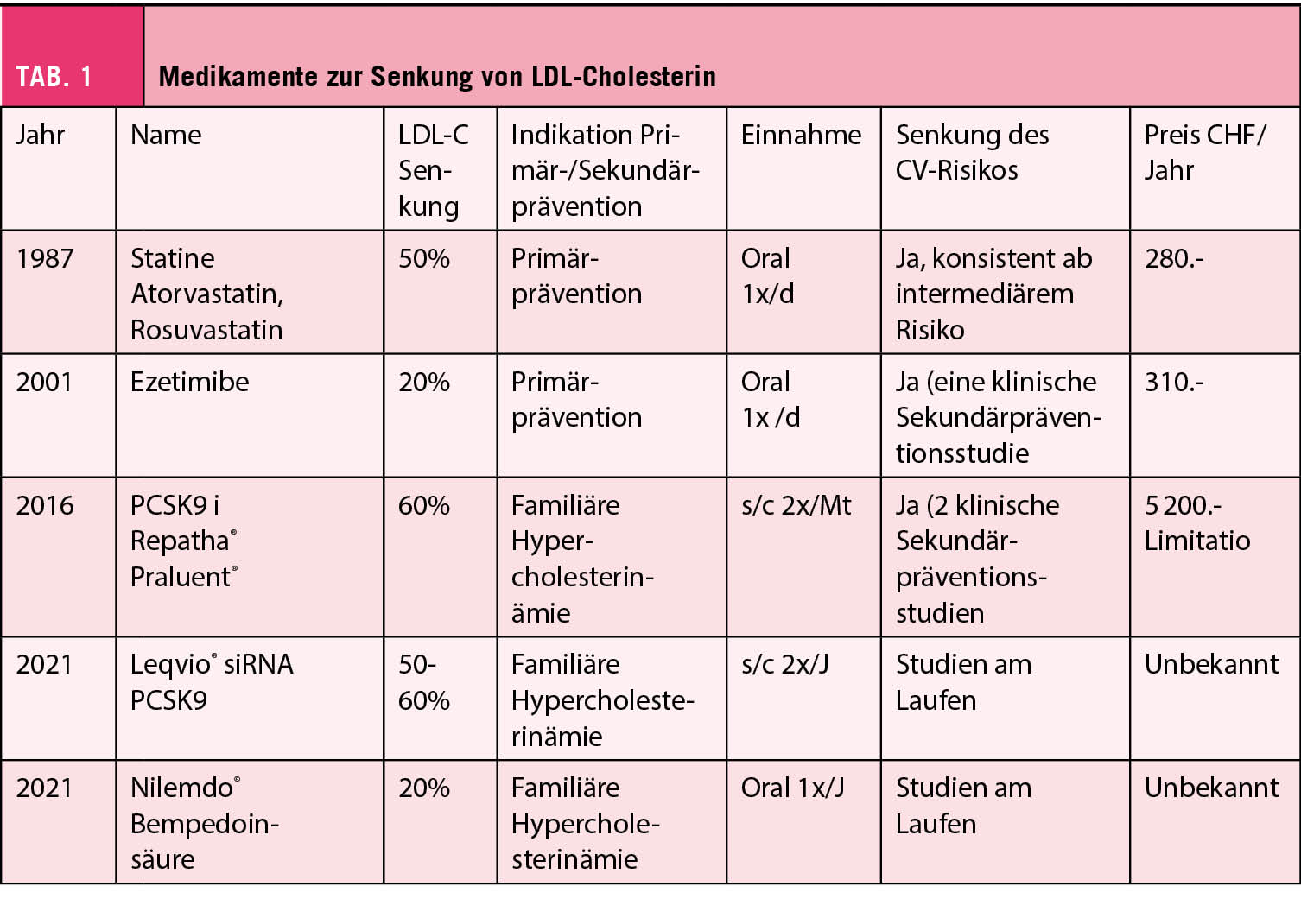 Der Referent zeigte einen kurzen Überblick über die derzeitigen LDL-C-Senker (Tab.1). Anschliessend erinnerte er an die Limitation für die PCSK9-Hemmer.
