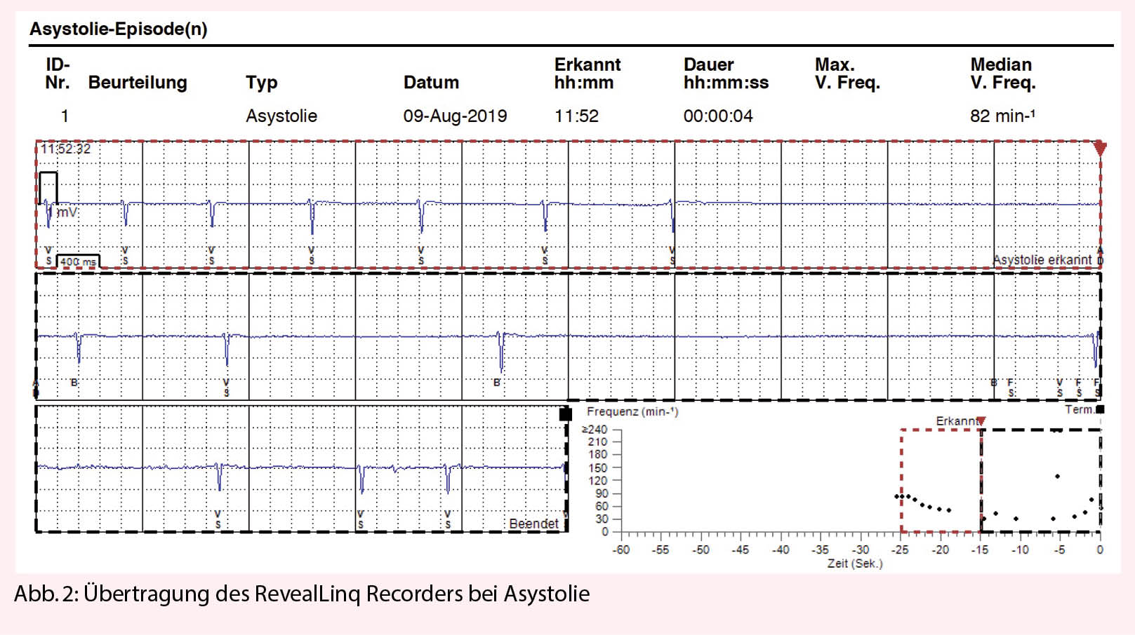 Rhythmogene Synkopen sind die häufigsten der kardial bedingten Synkopen, die 10% aller Synkopen ausmachen (5). Der implantierbare Langzeit-Recorder kann sehr gut eine rhythmogene Ursache erkennen, bzw. ausschliessen. Begünstigt durch Vorerkrankungen und Alter sind dies Bradykardien, bzw. Blockierungen im Sinus- oder AV-Knoten oder dann Tachykardien. Deswegen ist es sehr wichtig, dass eine verlässliche Diagnose schnell gestellt und die nötigen Massnahmen, oft die Implantation eines ICDs oder eines Herzschrittmachers, dann erfolgen.