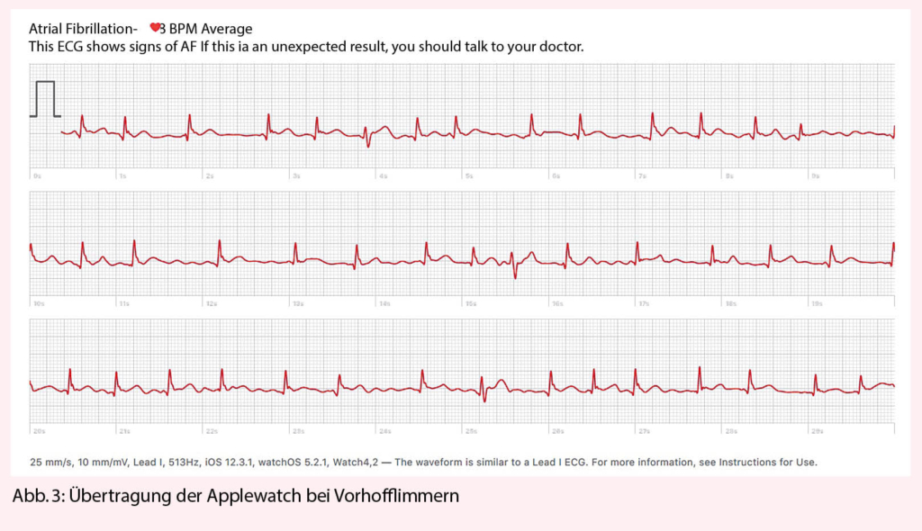 Heute besitzt fast jeder ein Smartphone und speichert damit dauernd eine Vielzahl von Daten. Nicht nur zu Konsumverhalten und der Nutzung von Telefon, Suchmaschinen und sozialen Netzwerken, sondern immer auch Daten zu Standort, Bewegungsverhalten und den Aktivitäten. Bereits über das Smartphone selber ist es möglich, mit der eingebauten Lampe und der Kamera über eine Photopletysmographie die Sauerstoffpulskurve zu messen und dadurch Informationen zu Herzfrequenz, Blutdruck und Sauerstoffsättigung zu speichern. Benutzen die Anwender zusätzliche Geräte wie ein Fitnessband oder eine Smartwatch, können diese Parameter ständig gemessen und kann je nach Ausstattung des Gerätes sogar eine EKG-Ableitung aufgezeichnet werden (Abb. 3). Eine stetig steigende Zahl von Benutzern dokumentiert so ihr Trainingsprogramm und ihre Freizeitaktivitäten und zeichnet auf diese Weise dauernd eine Reihe von Vitalparametern auf, die mit allen anderen Daten verknüpft werden können. Dazu können die Benutzer auch Angaben zu ihrem Befinden eingeben und gezielt die Daten mit ihren Symptomen verbinden. Für uns Ärzte wird die Situation komplex, weil immer mehr Leute mit immer mehr verschiedenen Geräten und Applikationen uns eine stetig steigende Menge von Daten präsentieren und wir nicht immer wissen können, wie zuverlässig die erhobenen Daten tatsächlich sind und welche Relevanz die Messungen haben.