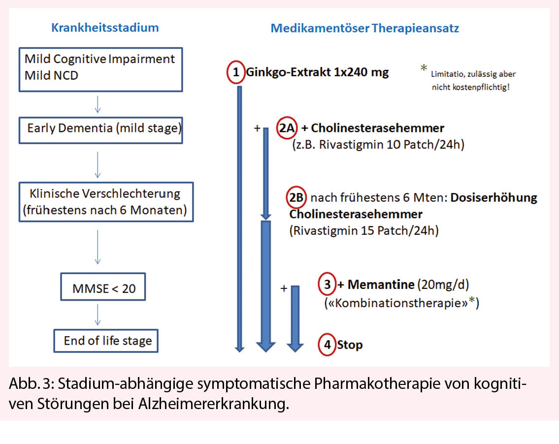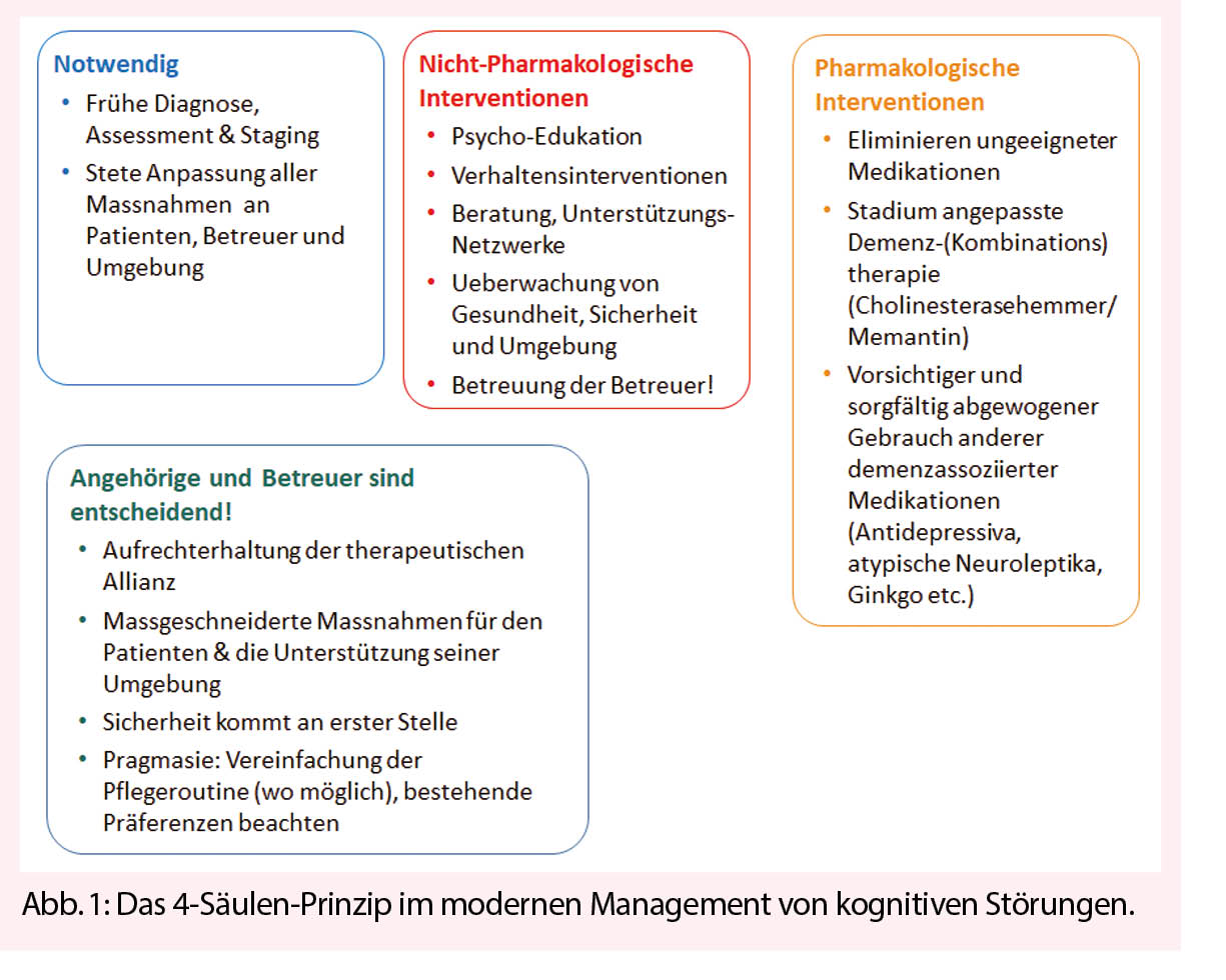 Mit Patientenklagen über kognitive Störungen können wir bei jüngeren Erwachsenen, aber ganz speziell im 3. und 4. Lebensalter konfrontiert werden. In jedem Fall müssen solche Klagen ernst genommen werden, da bei richtiger Diagnosestellung und frühzeitiger Einleitung von therapeutischen Massnahmen der weitere Verlauf massgeblich beeinflusst werden kann. Obwohl es seit Einführung der DSM-5 den Begriff «Demenz» eigentlich nicht mehr gibt, ist dieses im Alter häufige Krankheitsbild (jeder 3. über 85-Jährige betroffen!) natürlich nicht verschwunden. Zwar hat die Demenz-Inzidenz infolge deutlich besserer Behandlung von vaskulären Risikofaktoren in den letzten 20 Jahren bis zu 50% abgenommen – doch, der demographische Wandel hat diesen medizinischen Fortschritt zahlenmässig praktisch neutralisiert. Das moderne Management von kognitiven Störungen bei dementieller Entwicklung fusst auf 4 Pfeilern (Abb. 1): Frühe und präzise Diagnostik, medikamentöse Therapie, nicht-medikamentöse Therapiemassnahmen und gezielte Unterstützung/Begleitung der Angehörigen und Betreuer (1).