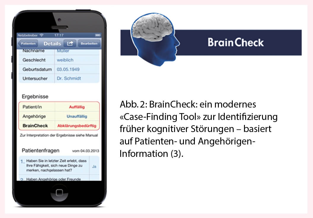 Im Praxisalltag muss schnell und mit wenig Zeitaufwand entschieden werden können, ob kognitive Störungen schnell weiter abgeklärt werden müssen, ob weiter beobachtet werden muss oder kein weiterer Handlungsbedarf besteht! Das frühere (zeitaufwändige) Screening von kognitiven Störungen mittels MMSE und Uhrentest wurde in den letzten Jahren vom sensitiveren und gezielten «Case Finding» mittels «App» abgelöst (Abb. 2)! Die von den «Swiss Memory Clinics» und Schweizer Hausärzten entwickelte kostenpflichtige «App» «BrainCheck» trennt in wenigen Minuten «Normal» von «Pathologisch» mit einer Trennschärfe von 90% (3)!