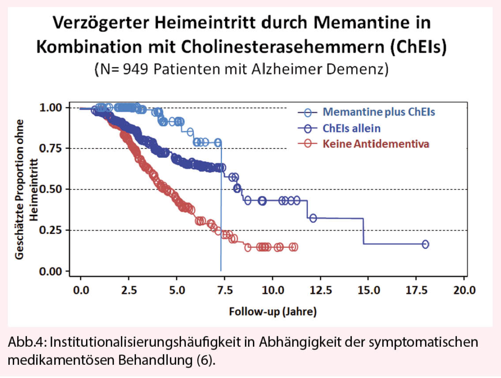 Bevor neue Medikamente zum Einsatz kommen, gilt es grundsätzlich, eine bereits vorhandene allfällige Polypharmazie auf kognitiv beeinträchtigende anticholinerge Substanzen zu überprüfen. Handelt es sich gemäss DSM-5 um «major» kognitive Störungen (Demenz), ist für die Festlegung der medikamentösen Therapie (meist mittels Bildgebung und/oder Biomarker) die dem Prozess zugrundeliegende Neuropathologie entscheidend. Handelt es sich um einen neurodegenerativen Prozess (Alzheimer Erkrankung), sind Stadium-abhängig Ginkgo, Cholinesterasehemmer und Memantine Mittel der ersten Wahl (Abb. 3). Bei dieser symptomatischen Therapie wird (bei frühzeitigem Beginn) der Verlauf der Krankheit bzgl. Funktionalitäts- und Selbständigkeitserhalt massgeblich verbessert. Diese Medikamente wirken ausgesprochen langsam, sind aber dank einer «Number Needed to Treat» (NNT) von unter 10 (für alle drei Substanzklassen!) mit einer hohen Responder-Rate versehen. Im Vergleich zu nicht-behandelten Kontrollpopulationen treten erste klinische Differenzen jedoch erst nach einem Jahr Behandlung auf; diese werden in den weiteren Jahren aber sehr relevant, da die Behandlung zu eindrücklich weniger Pflegeheimeintritten führt (6) (Abb. 4). Hier hat sich v.a. auch die Kombinationstherapie von Memantine mit Cholinesterasehemmer (bei MMSE < 20) als sehr erfolgreich erwiesen. Diese ist in der Schweiz jedoch nur off-label-mässig möglich und wegen einer Limitatio nicht voll von der Grundversicherung übernommen. Trotzdem: viele Patienten tragen (angesichts stark gefallener Antidementiva-Preise) die paar Hundert Franken pro Jahr gerne selber, wenn damit finanziell viel höhere Kosten einer Institutionalisierung gespart werden können. Neben der durch Antidementiva länger erhaltenen Alltagsfunktionalität treten unter dieser Therapie auch signifikant weniger demenz-assoziierte Verhaltensauffälligkeiten auf (Aggression, Schreien, motorische Unruhe etc.).