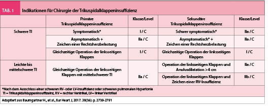 Gemäss den aktuellen europäischen Leitlinien besteht eine Klasse I C-Empfehlung für die chirurgische Korrektur beim Vorliegen einer schweren symptomatischen primären TI sowie bei einer sekundären TI bei Pateinten, welche einer linksseitigen Klappenoperation unterzogen werden. Wenn technisch machbar, ist die Rekonstruktion (meist mittels Ring-Anulopastie) einem Klappenersatz vorzuziehen. Beobachtungsstudien haben gezeigt, dass die Rekonstruktion der Trikuspidalklappe (TK) während einer linksseitigen Klappenoperation die TI langfristig relevant reduziert, das Remodeling des rechten Ventrikels (RV) begünstigt und die Lebensqualität der Patienten verbessert ohne das operative Risiko signifikant zu erhöhen (22, 23). Somit wird eine Rekonstruktion bereits bei einer leichten oder mittelschweren sekundären TI im Falle einer Anulusdilatation (> 40mm, 21mm/m2) empfohlen (Klasse IIa, Level C). Der Nutzen einer Operation im Falle einer isolierten TI ohne begleitende linksseitige Klappenerkrankungen konnte bislang nicht gezeigt werden. Tabelle 1 fasst die aktuellen Richtlinien für die chirurgische Behandlung der TI basierend auf den derzeit geltenden Leitlinien zusammen. Obwohl die Chirurgie als Standardverfahren betrachtet wird, ist die Evidenz eines Überlebensvorteils verglichen mit einer rein medikamentösen Therapie limitiert und das perioperative Risiko in multizentrischen Registern trotz steigender Erfahrung weiterhin hoch (geschätzte perioperative Mortalität 9-10%) (20, 21). Neuere Studien zeigen allerdings, dass sorgfältig ausgewählte Patienten mit hoher Erfolgsrate und tiefem Risiko in erfahrenen Zentren operiert werden können.