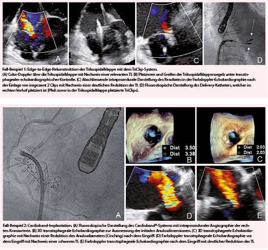 Ist der Hauptinsuffizienzjet bei einer rein sekundären TI zentral lokalisiert, kann eine direkte Transkatheter-Anuloplastie erfolgen, für welche derzeit allein das Cardioband®-System (Edwards Lifesciences, Irvine, USA) in Trikuspidalposition zugelassen ist. Bei diesem System handelt es sich um ein Polyesterband, welches mit einer verstellbaren Spule verbunden ist. Durch das Band wird eine variable Anzahl von Schrauben (bis zu 17) in den Trikuspidal-Anulus implantiert, welcher dann durch das abschliessende Anziehen des Bandes (Cinching) in seiner Zirkumferenz verkleinert wird. Das Verfahren wird unter fluoroskopischer und echokardiographischer (TEE) Kontrolle durchgeführt. Interaktionen (Perforation oder Okklusion) mit der rechten Kranzarterie, welche in unmittelbarer Nähe zum TK-Anulus liegt, müssen vermieden werden. Hierzu ist eine Computertomographie der TK zur Evaluation der anatomischen Eignung, sowie regelmässige Angiographien der rechten Kranzarterie während der Prozedur erforderlich (Fall-Beispiel 2) (31, 32). Die europäische Zulassungsstudie mit 30 Patienten zeigte einen technischen Erfolg in allen Fällen. Klinisch relevante Komplikationen innerhalb der ersten 30 Tage nach Interventionen waren Blutungskomplikationen (in 4 Fällen), Komplikationen der rechten Kranzarterie (in 3 Fällen) und Rhythmusstörungen (in 3 Fällen). Nach 6 Monaten hatten sich 76% der Patienten um mindestens eine NYHA-Funktionsklasse verbessert, 88% waren in der NYHA-Funktionsklasse I oder II, mit ebenfalls signifikanter Besserung der Sechs-Minuten-Gehdistanz (33). Nach 6 Monaten betrug die Mortalität 10%.