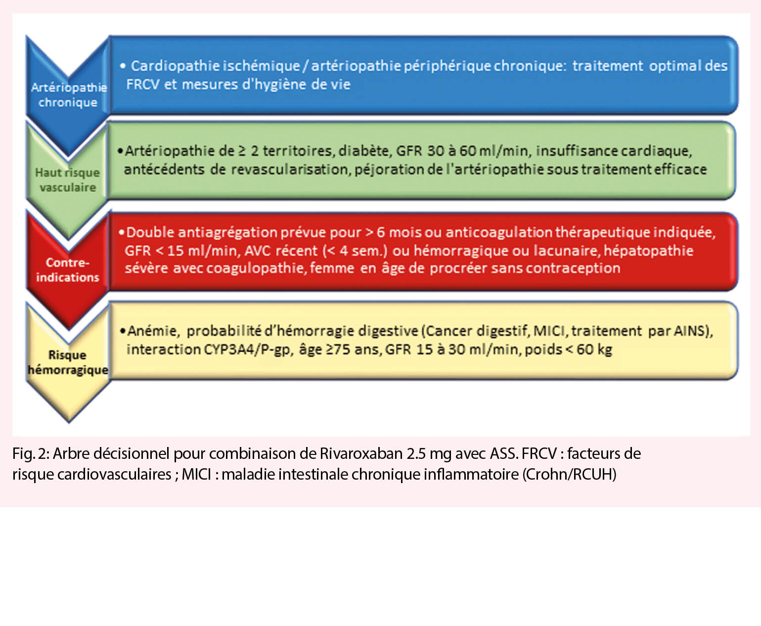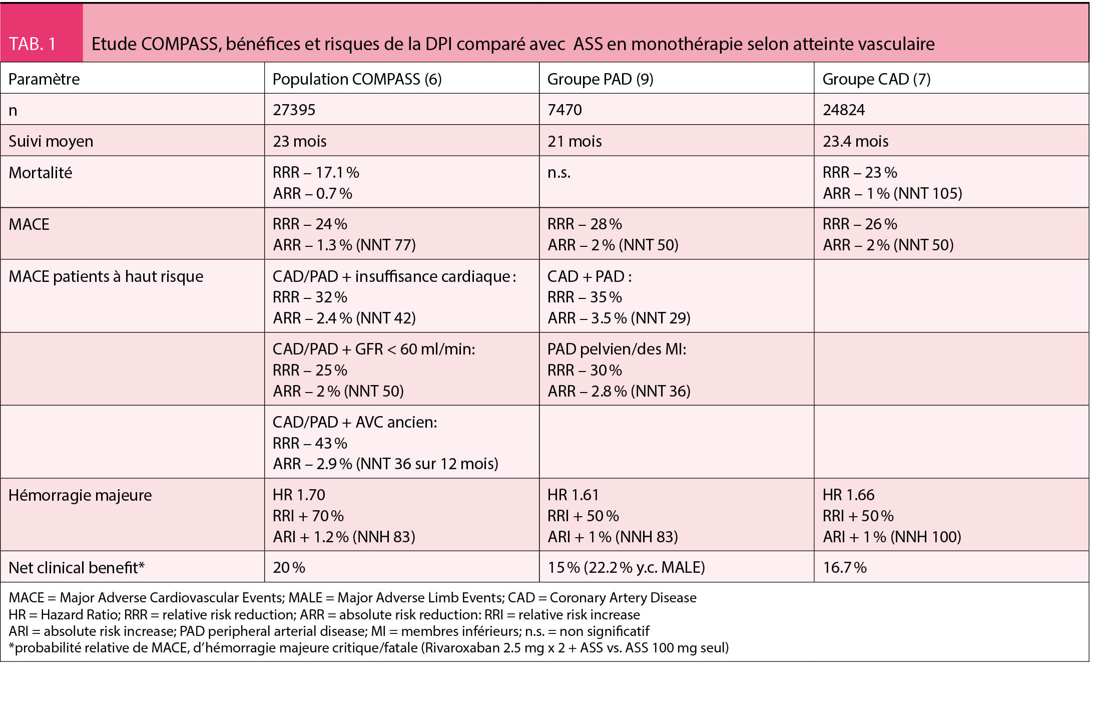 L’ artériopathie des lits vasculaires coronariens, cérébraux et périphériques demeure une des causes principales de mortalité et de morbidité des pays industrialisés. L’ étiologie principale de la maladie cardiovasculaire (CV) est l’ athéromatose. Une occlusion artérielle est souvent déclenchée par une rupture de plaque avec formation de thrombus (1). L’ antiagrégation, bien établie dans la prévention secondaire, n’ est que partiellement efficace. Selon le registre REACH, 12 % des patients sous traitement optimal subissent un événement CV majeur (MACE : major adverse cardiac event) sur 3 ans (2). Une atteinte polyvasculaire augmente la mortalité de 4.7 à 8.8 % et les MACE de 10.5 à 17.9 %. En recherche de meilleurs traitements pour ces patients à haut risque, la combinaison d’ une anticoagulation et antiagrégation a été investiguée. La combinaison d’ antagonistes de la vitamine K avec AAS diminue les occlusions artérielles après infarctus du myocarde ou syndrome coronarien aigu (3) et lors d’ artériopathie périphérique (4), mais le haut risque hémorragique la rend obsolète. L’ arrivée des nouveaux anticoagulants directs avec un profil de sécurité favorable a relancé la question du traitement combiné. Un traitement combiné innovant par rivaroxaban en posologie réduite à 2 x 2.5 mg/jour plus AAS, nommé « double pathway inhibition » (DPI) a montré une efficacité et sécurité favorables dans une étude pilote (5), et a ensuite été comparé à l’ AAS dans deux grandes études prospectives (COMPASS, VOYAGER PAD).