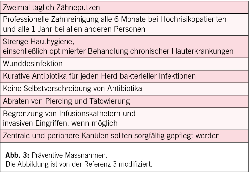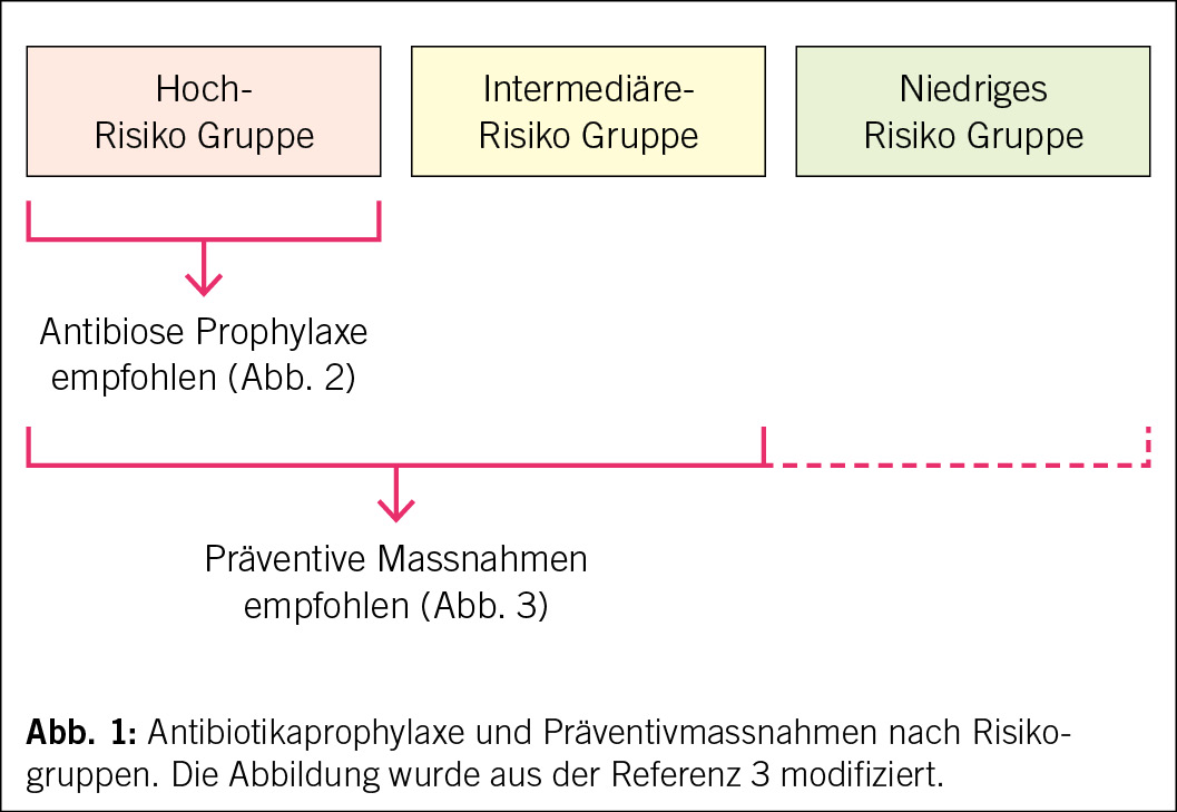 In den ESC-Leitlinien 2023 wird das Risiko der Bevölkerung für Endokarditis in Hoch-, Mittel- und Niedrigrisikogruppen eingeteilt. Die Antibiotikaprophylaxe vor zahnärztlichen Eingriffen wird nur bei Patienten mit hohem Risiko (Klasse I) empfohlen, während bei Patienten mit mittlerem Risiko (und idealerweise auch bei solchen mit niedrigem Risiko) Präventionsmassnahmen zwingend empfohlen werden (Abb. 1, 2 und 3).