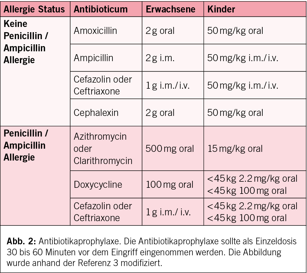 Das Rationale der Antibiotikaprophylaxe ist, dass durch die Reduzierung der Bakteriämie, die mit verschiedenen (vor allem oralen) Eingriffen verbunden ist, das Risiko einer bakteriellen Kolonisierung von Herzstrukturen minimiert wird. Tatsächlich befindet sich in der Mundhöhle eine reichhaltige kommensale Flora, und obwohl selbst alltägliche Tätigkeiten wie Zähneputzen, Kauen und die Verwendung von Zahnseide für eine Bakteriämie verantwortlich sein können, gibt es Hinweise darauf, dass eine Reihe von zahnärztlichen Eingriffen mit einem erhöhten Endokarditis-Risiko verbunden sein können. Dazu gehören: Zahnextraktionen, oralchirurgische Eingriffe (einschliesslich Parodontal-Chirurgie, Implantat-Chirurgie und orale Biopsien) und zahnärztliche Eingriffe, bei denen das Zahnfleisch oder der periapikale Bereich der Zähne manipuliert wird (einschliesslich Zahnsteinentfernung und Wurzelbehandlung) (4, 5).