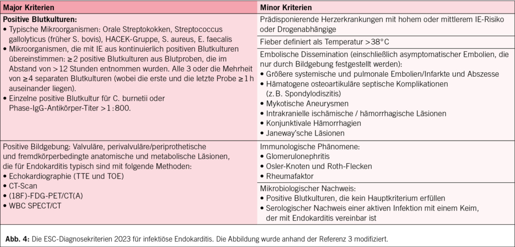 Der erste Verdacht auf eine Endokarditis ergibt sich in der Regel aus klinischen und Labordaten, wobei die kardiale (und extrakardiale) Bildgebung wichtige diagnostische Anhaltspunkte bietet. Die klassischen Duke-Kriterien für die Diagnose wurden in den ESC-Leitlinien 2023 leicht modifiziert und sind in Abb. 4 zusammengefasst.