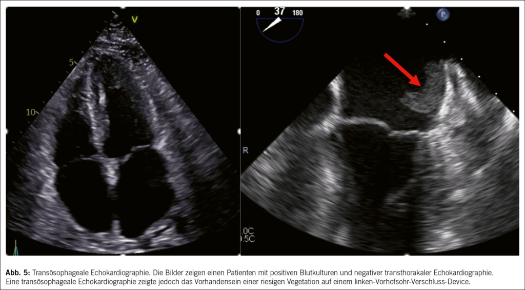 • Was die Echokardiographie anbelangt, so ist die Indikation zur Transoesophageale über die Transthorakale Echokardiographie hinaus inzwischen zu einer Indikation der Klasse I aufgewertet worden. Tatsächlich erlaubt die transoesophageale Echokardiographie bei vielen Patienten eine bessere diagnostische Performance (mit der einzigen möglichen Ausnahme einer isolierten rechtsseitigen Endokarditis) und ermöglicht die frühzeitige Erkennung von Komplikationen, Abb. 5.
