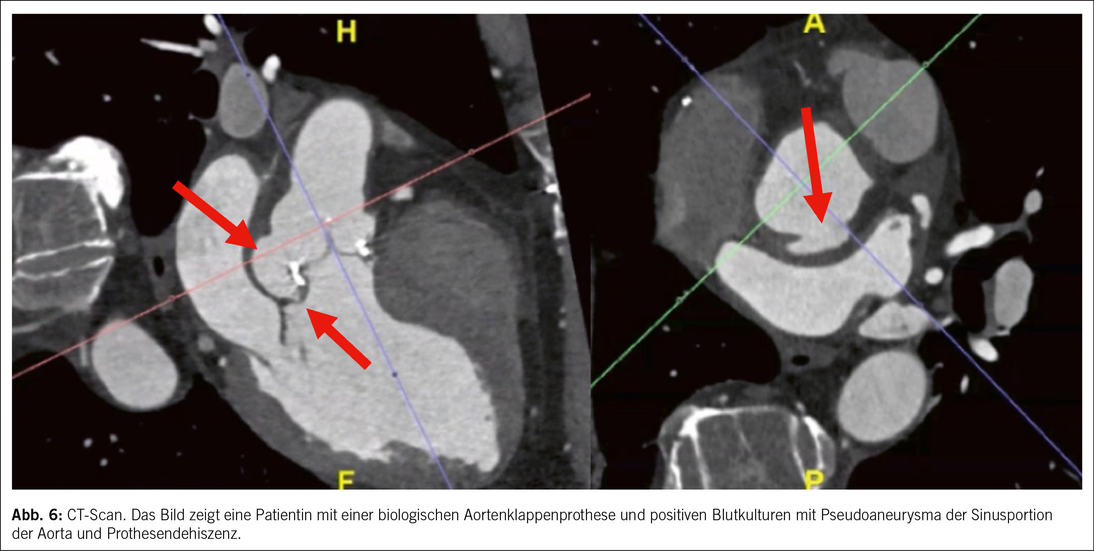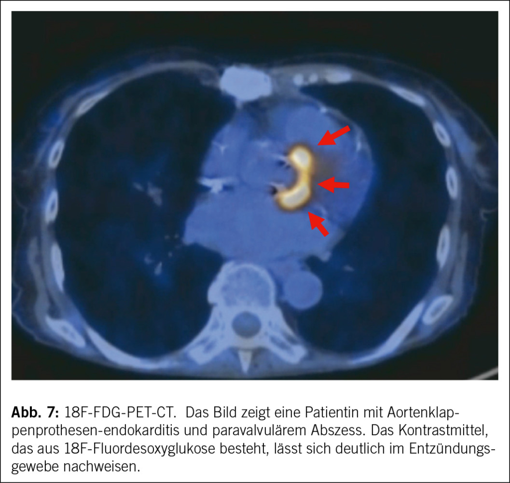 • Ein multimodaler Bildgebungsansatz wird dringend empfohlen. Neuere Studien haben gezeigt, dass die kardiale CT-Scan eine sehr gute diagnostische Aussagekraft für die Diagnose von Herzklappenläsionen und perivalvulären Komplikationen bei nativer Klappenendokarditis hat, während die PET-CT eine sehr gute Aussagekraft für die Diagnose von Endokarditis bei Herzklappenprothesen hat (9, 10), Abb. 6 und 7. Die Magnetresonanz Untersuchung ist nicht geeignet, um kardiale Vegetation oder Komplikationen zu erkennen, kann aber nützlich sein, um Fernläsionen zu entdecken.