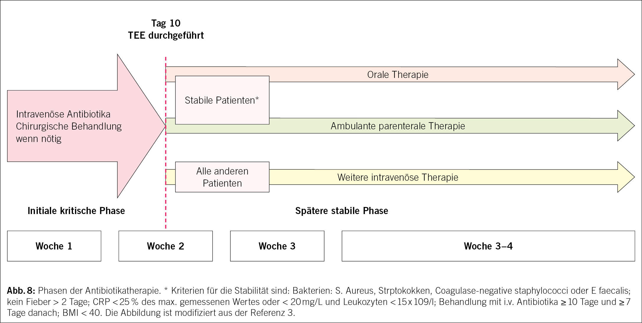 Die wichtigste Neuerung bei der antibiotischen Behandlung der infektiösen Endokarditis ist die Möglichkeit, nach der Anfangsphase auf eine orale Behandlung umzusteigen, wenn bestimmte Stabilitätskriterien erfüllt sind. Diese Empfehlung stammt aus der POET-Studie, einer randomisierten, multizentrischen Studie, die an 400 Patienten mit linksseitiger Endokarditis durchgeführt wurde; nach einer ersten Phase mit intravenöser Behandlung wurden die Patienten randomisiert, um die intravenöse Behandlung fortzusetzen oder auf eine orale Antibiotikabehandlung umzusteigen, wenn Stabilitätskriterien erfüllt waren. Es gab keinen Unterschied zwischen den intravenös (12 %) und oral (9 %; p = .40) behandelten Patienten in Bezug auf die Gesamtmortalität, ungeplante Herzoperationen, embolische Ereignisse oder ein Rezidiv der Bakteriämie (12). Bei der nachfolgenden veröffentlichten Verlängerung der Follow-up-Studie auf mehr als 5 Jahren zeigte sich die «Step-down»Behandlung mit oraler Therapie sogar als besser mit einer geringeren Inzidenz von Ereignissen bei den oral Behandelten (33 %) im Vergleich zur intravenösen Behandlung (45 %) (13).