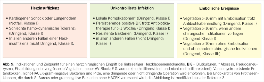 Die drei Hauptindikationen für eine Operation sind Herzinsuffizienz, Anzeichen einer unkontrollierten Infektion und die Vermeidung von Embolierisiken. Der Zeitpunkt der Operation kann als Notfall eingestuft werden, wenn der Eingriff innerhalb von 24 Stunden durchgeführt werden muss, als dringend, wenn der Eingriff innerhalb von 3 bis 5 Tagen durchgeführt werden sollte, und als nicht dringend, wenn die Indikation zur Durchführung des Eingriffs innerhalb desselben Spitalaufenthalts besteht. Die Abb. 9 gibt einen Überblick über die Indikation und den Zeitpunkt für einen herzchirurgischen Eingriff. Darüber hinaus wird eine chirurgische Behandlung auch bei einer frühen Endokarditis der Herzklappenprothese (innerhalb von 6 Monaten nach der Implantation) empfohlen als Indikation der Klasse I.