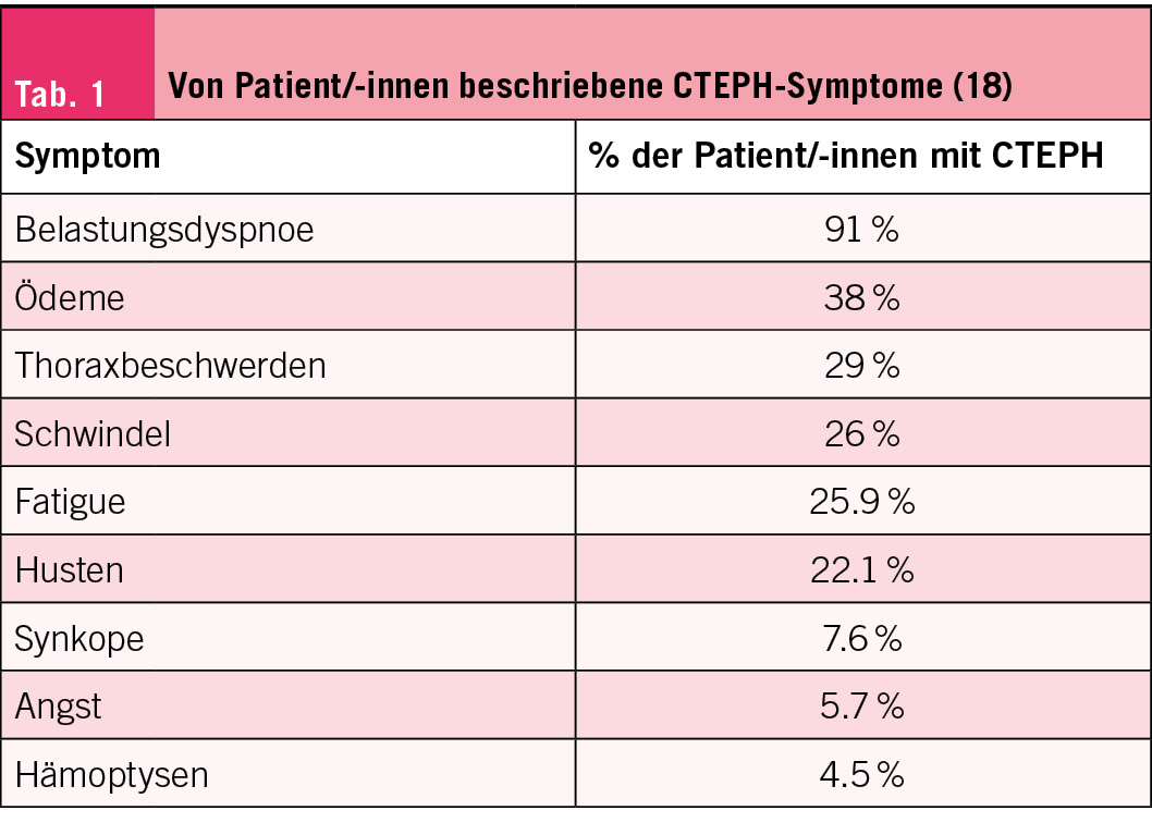 Die Symptomatik der CTEPH ist unspezifisch, da sie durch die Dysfunktion des rechten Ventrikels als Folge der PH verursacht ist, was die Diagnosestellung erschwert. Als erstes Leitsymptom beschreiben die meisten Patient/-innen eine Belastungsdyspnoe, welche unbehandelt progressiv zunimmt (17). Weitere Symptome sind in Tab. 1 zusammengefasst (18). Die klinischen Befunde sind unspezifisch, abgesehen von einer möglichen Akzentuierung der pulmonalen Komponente des zweiten Herztons.