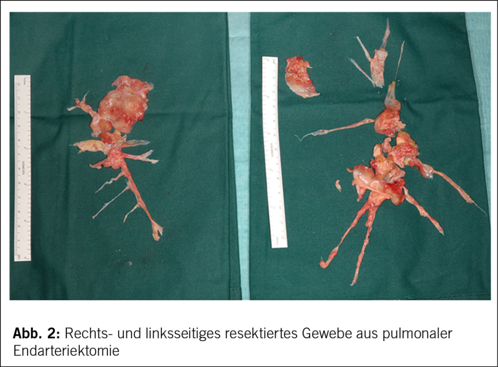 Der chirurgische Zugang erfolgt via medianer Sternotomie. Wichtig ist eine gute Sicht auf das Operationsfeld, erreicht durch einen kardiopulmonalen Bypass sowie kurzzeitigem hypothermem Kreislaufstillstand (31). Die visuell identifizierte Dissektionsebene in der Gefässwand wird von proximal nach distal verfolgt und die Okklusion bis subsegmental entfernt (37). Dies ist wichtig, da eine Thrombektomie ohne Endarteriektomie den PVR nicht senkt (38). Die postoperativ häufigsten Komplikationen, das Reperfusionsödem der Lunge und eine residuelle PH im Rahmen der konkomittierenden Mikroangiopathie, treten oft gemeinsam auf und werden, wenn nötig, mit einer überbrückenden extrakorporalen Membran-oxygenierung (ECMO) behandelt (39, 40).