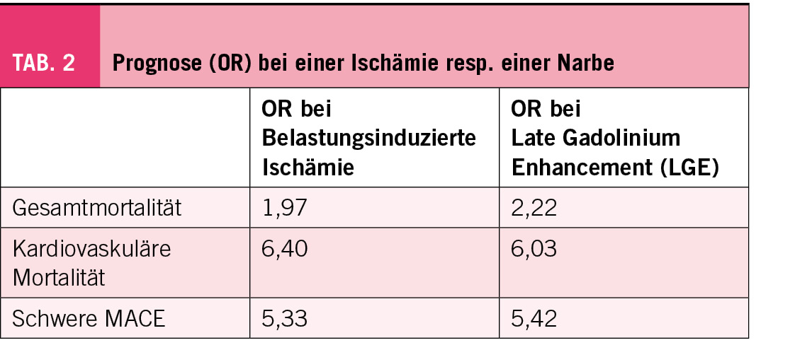 Gemäss einer aktuellen systematischen europäischen Übersichtsarbeit und Meta-Analyse im JAMA Cardiology vom 7. Juni 2023 von Ricci F. et al. bestätigt sich, dass das MRI zur Diagnose und Prognose eine ausgezeichnete Bildgebung ohne Strahlenbelastung ist (1). Es wurden insgesamt 64 Studien ausgewertet: davon 33 diagnostische Studien mit 7814 Patienten und 31 prognostische Studien mit 67’080 Patienten in den Jahren 2000-2021. Dies bei Personen mit stabiler Angina pectoris bei bekannter oder vermuteter koronarer Herzkrankheit (CHK). Es ergaben sich für den Nachweis einer funktionellen obstruktiven Stenose folgende Resultate (Tab. 1). Bei einer belastungsinduzierten Ischämie bestand eine schlechte Prognose ebenso beim Nachweis eines Late Gadolinium enhancement resp. einer Fibrose oder Narbe (Tab. 2).