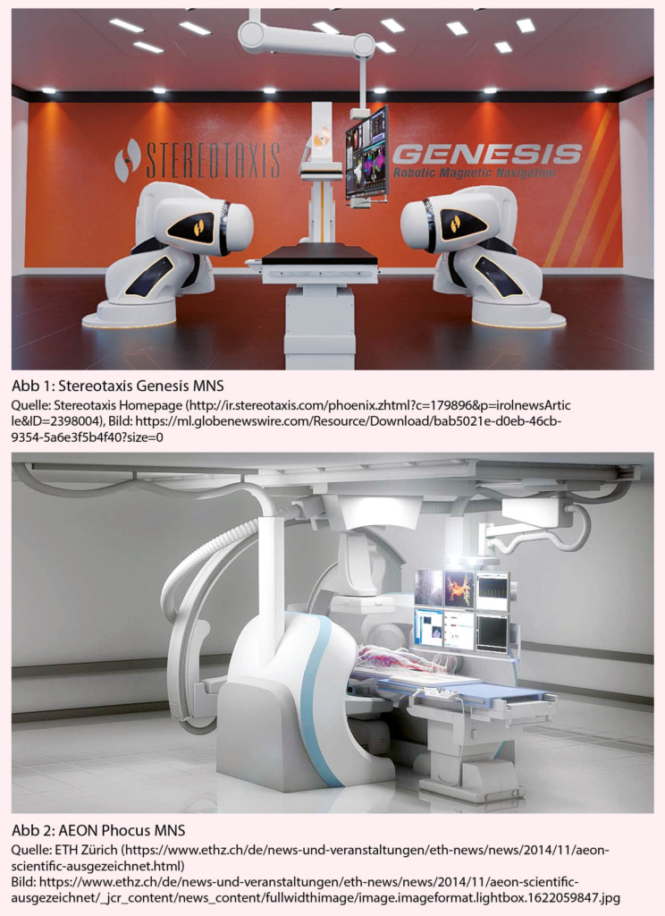 Weltweit wurden bisher über 100 000 Patienten mit dem MNS behandelt. Mit Genesis RMN wurde im April 2019 die neueste Generation des Systems präsentiert. Die Magnete wurden verkleinert und auf flexiblen Roboterarmen montiert, wodurch eine raschere Ansprechzeit und grössere Flexibilität erreicht werden konnte. In Kombination mit einer angepassten Röntgenanlage soll ein vollintegrierter robotischer Interventionsraum entstehen (8). Ein weiteres MNS der Firma AEON Scientific, einem Spin-off der ETH Zürich, wurde in den Jahren 2012-2015 bis zum Erhalt des CE-Mark entwickelt (Abb. 2). Anstelle von Permanentmagneten werden bei diesem System Katheter durch veränderbare elektromagnetische Felder gesteuert. Ein erstes System konnte erfolgreich bei Patienten verwendet werden. Derzeit laufen an der ETH Zürich Forschungsarbeiten für eine nächste Generation mit verkleinerten Elektromagneten.