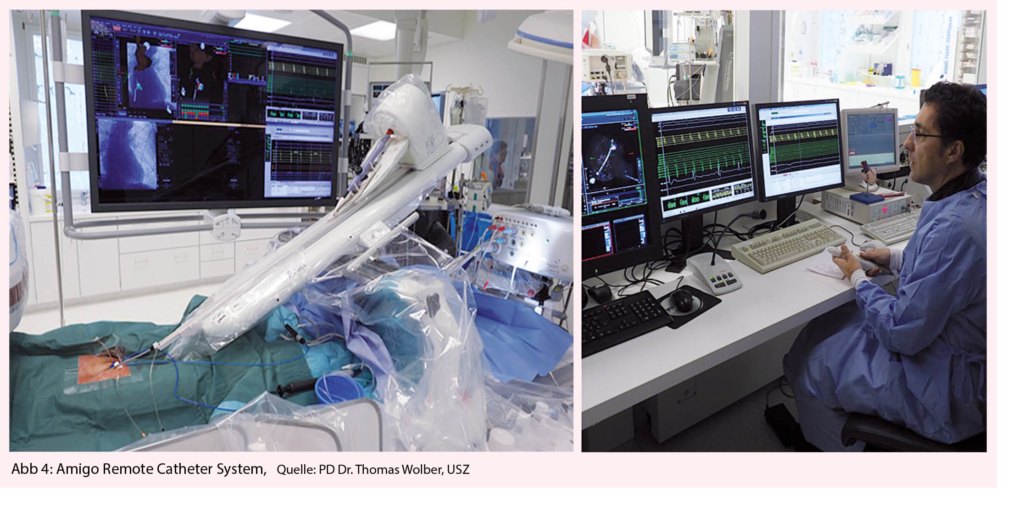 Eine grössere Bedeutung spielen robotische Systeme in der Rhythmologie. Die Katheterablation mit Radiofrequenzenergie ist eine etablierte Therapieform zur Behandlung supraventrikulärer und ventrikulärer Tachyarrhythmien. Elektroanatomische Mappingsysteme ermöglichen eine dreidimensionale Darstellung der zu untersuchenden Herzhöhlen durch Abtasten der endokardialen Oberfläche und Registrierung der lokalen Amplitude und Ausbreitung der elektrischen Aktivierung des Myokards («Mapping»). Diese Mappingsysteme haben die konventionelle Untersuchung unter Röntgenkontrolle bei der Behandlung komplexerer Arrhythmien weitgehend ersetzt, wodurch die Strahlenexposition für Patienten und Untersucher deutlich reduziert werden konnte. Die katheterbasierte Behandlung von komplexen atrialen Tachykardien, Vorhofflimmern und ventrikulären Tachykardien erfordert eine hohe Expertise und manuelles Geschick. Die oft lange Interventionsdauer stellt eine Belastung für den Untersucher dar und komplexe Eingriffe sind weiterhin mit längeren Röntgenzeiten verbunden. Systeme zur Fernsteuerung von Ablationskathetern wurden entwickelt um durch eine stabile Katheterführung die Effektivität und Sicherheit der Eingriffe zu optimieren sowie die Strahlenexposition und physische Belastung von Untersuchern zu minimieren. Derzeit werden vorwiegend das magnetische Navigationssystem (MNS) Niobe (Stereotaxis Inc., St. Louis, MO, USA) sowie das mit einem Roboterarm und speziellen elektromechanischen Schleusen arbeitende Navigationssystem (remote navigation system, RNS) Sensei (Hansen Medical Inc., Mountain View, CA, USA) klinisch eingesetzt. Zudem wurde ein mit konventionellen Ablationskathetern kompatibles RCS (Amigo Remote Catheter System, Catheter Precision Inc., Mount Olive, NJ, USA) verfügbar. Bei diesem RCS erfolgt die Steuerung direkt über die im jeweiligen Katheter integrierten Steuergriffe. Ein innovatives System mit direkter Kathetersteuerung mithilfe dynamischer Magnetfelder (Aeon) konnte erfolgreich im Tierversuch und beim Menschen getestet werden, ist jedoch aktuell nicht kommerziell erhältlich.