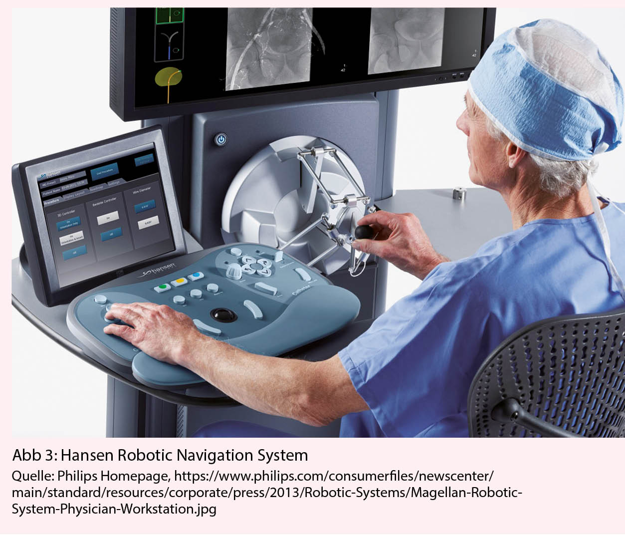 Interventionelle Kardiologen sind einer beträchtlichen Strahlenbelastung sowie Belastungen der Wirbelsäule durch schwere Bleischürzen ausgesetzt. Durch den Einsatz von robotischen Systemen ist eine räumliche Trennung des Untersuchers vom Patienten und von der Röntgenanlage möglich. Dadurch kann die Belastung des Untersuchers deutlich reduziert werden und es können auch telemedizinische Szenarien mit robotischen Interventionen in abgelegenen Spitälern entwickelt werden. Der Prototyp eines robotischen Systems für perkutane kardiale Interventionen (PCI) wurde ab 2006 getestet, ein kommerzielles System ist seit 2012 erhältlich (CorPath 200; Corindus, Waltham, MA, USA). Es wurden jedoch bislang nur wenige 100 Patienten weltweit behandelt (3, 4). Für Akutbehandlungen und komplexe Mehrgefässerkrankungen ist das System derzeit noch ungeeignet.