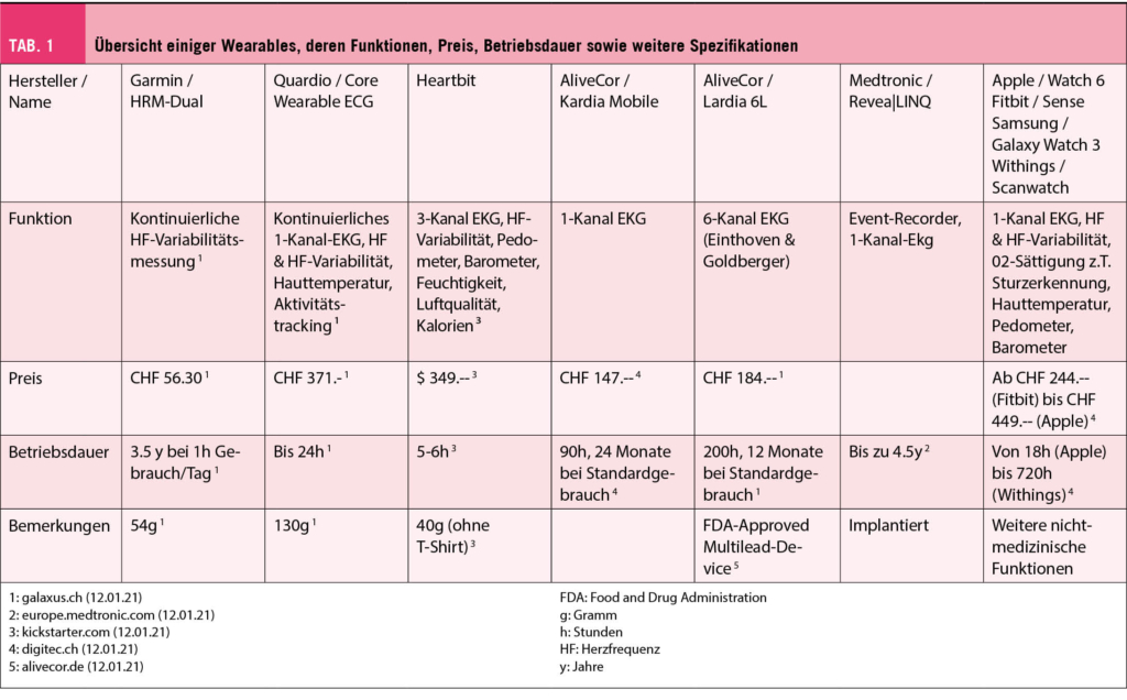 Smartwatches verdrängen seit einigen Jahren die traditionellen Armbanduhren beim Verkauf. Die Akzeptanz und Nutzung von tragbaren Geräten nimmt in unserer Bevölkerung zu. In diesem Überblick möchten wir die Technologie, die wissenschaftlichen Daten, die klinischen Implikationen und die Herausforderungen bei der Rhythmusdiagnose mit «Wearables» beschreiben und kommentieren. Wir befassen uns mit den Fortschritten der Technologie in den letzten Jahren, den verschiedenen verfügbaren Geräten, ihrer Verwendbarkeit und ihren Grenzen sowie mit der Erkennbarkeit verschiedener Arrhythmien anhand von mit Wearables aufgezeichneten 1-Kanal-EKGs.