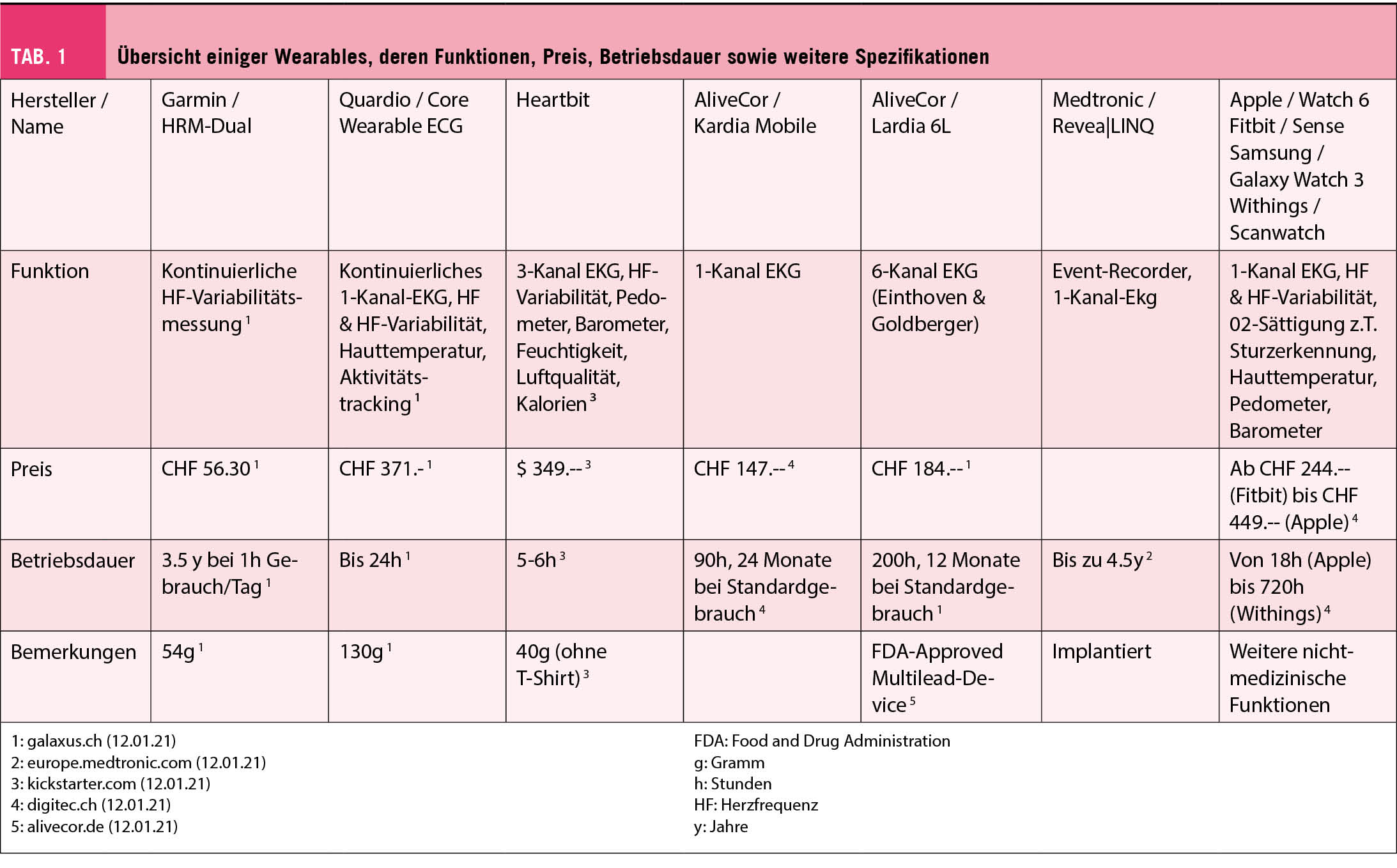 Grundsätzlich müssen auch hier wieder zwei Arten von EKG-fähigen Wearables unterschieden werden: Diejenigen, welche im Stande sind, ein 1-Kanal EKG (Single-lead EKG) aufzuzeichnen und diejenigen, welche ein Mehrkanal EKG (Multilead EKG) aufzeichnen können. Eine Übersicht gängiger, verfügbarer Devices bietet Tabelle 1.