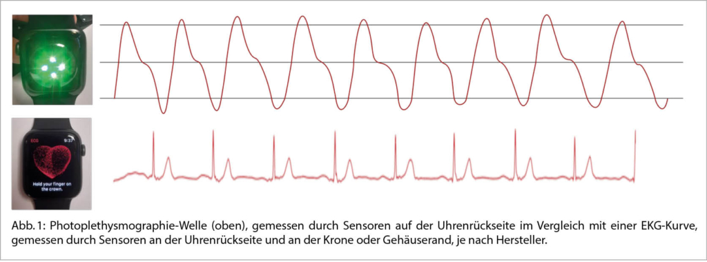 1961 publizierte Holter mit «New method for heart studies» seine Arbeit über den gleichnamigen portablen EKG-Recorder, welcher ausserhalb eines Spitals verwendet werden konnte und legte somit den Grundstein der tragbaren Rhythmusdiagnostik (1). Somit existiert bereits seit mehr als einem halben Jahrhundert die Grundlage für moderne Wearables zur Erfassung und Übertragung von EKG-Daten, wie wir sie heute in verschiedensten Formen kennen. Gegenüber den in der Klinik herkömmlich verwendeten Monitorstrategien, wie Holter oder implantierbaren Loop-Recordern, sind massentaugliche Wearables für Endnutzer günstiger, angenehmer zu tragen und bieten auch einen persönlichen Anreiz durch den (vermeintlichen) Nutzen sowie die Auswertung von erhobenen Daten über den eigenen Körper- oder Trainingszustand. Es ist wahrscheinlich, dass in Zukunft Wearables wie heutzutage Mobiltelefone in der Bevölkerung verbreitet sein werden. Algorithmen können bereits zuverlässig Vorhofflimmern (VHF) detektieren und Wearables sind nun fest in den 2020 Vorhofflimmer ESC-Guidelines verankert (2). Besonders Uhren erfreuen sich enormer Beliebtheit, da diese unauffällig, bequem und in den meisten Alltagssituationen ohne Einschränkungen oder Stigmatisierung getragen und benutzt werden können.